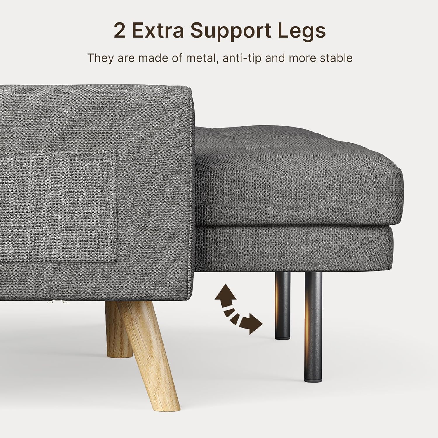 Gizoon Futon Sofa Bed, 70.9″ Futon Couch with Adjustable Backrest, Removable Armrest for Extended Length, Mid Century Modern Loveseat for Living Room, 6 Wood Legs, 2 Metal Support Rods, Dark Grey