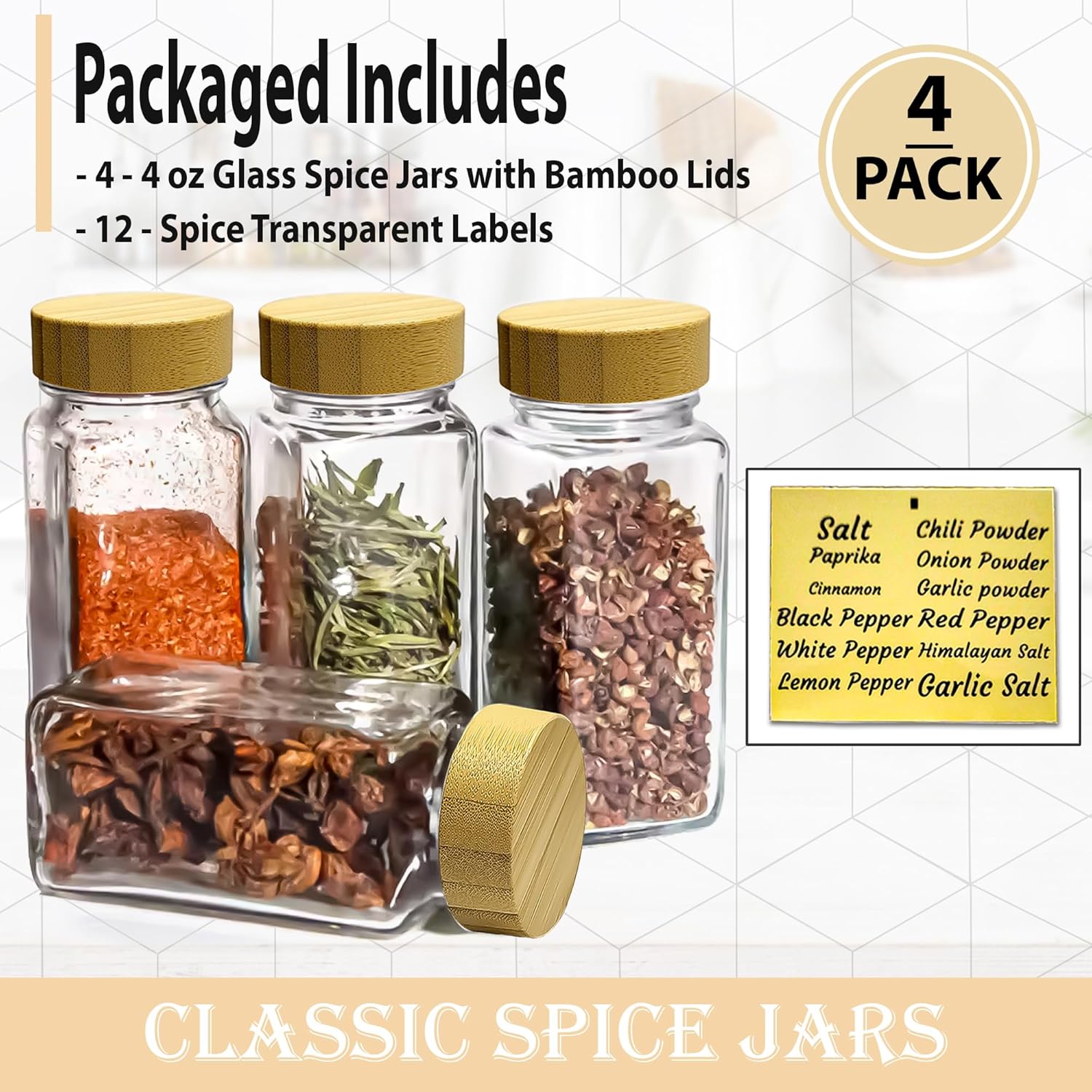 GREAT VALUE PACK – This Set Includes 4 – 4 oz Empty Square Glass Spice Jars with Bamboo Lids, and 12 – Spice Transparent Labels.