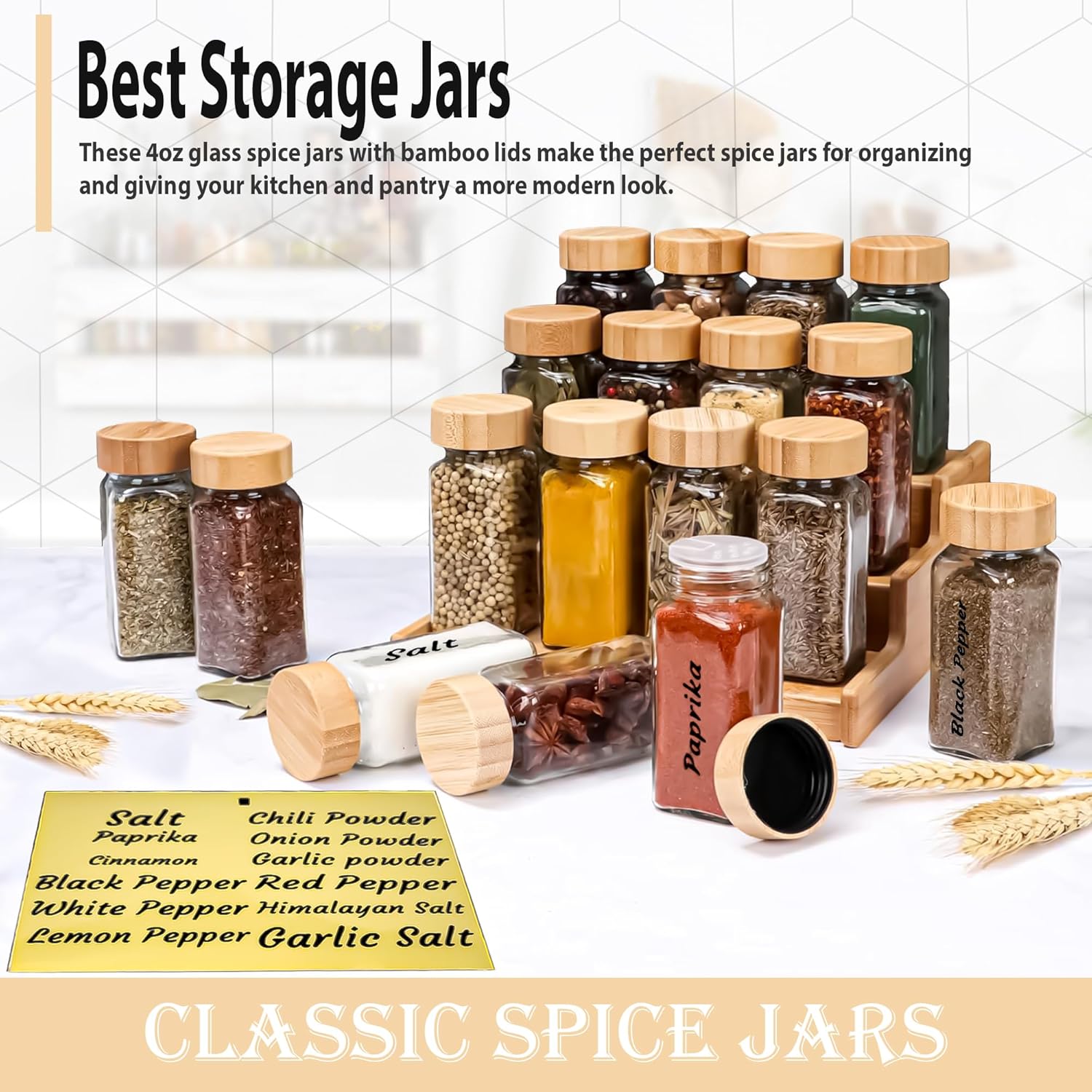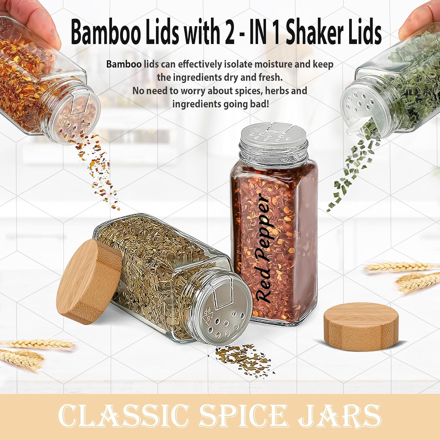 AIRTIGHT BAMBOO LIDS – Bamboo Lids can Effectively Isolate Moisture and Keep the Ingredients Dry and Fresh. No Need to Worry about Spices, Herbs and Ingredients Going Bad.