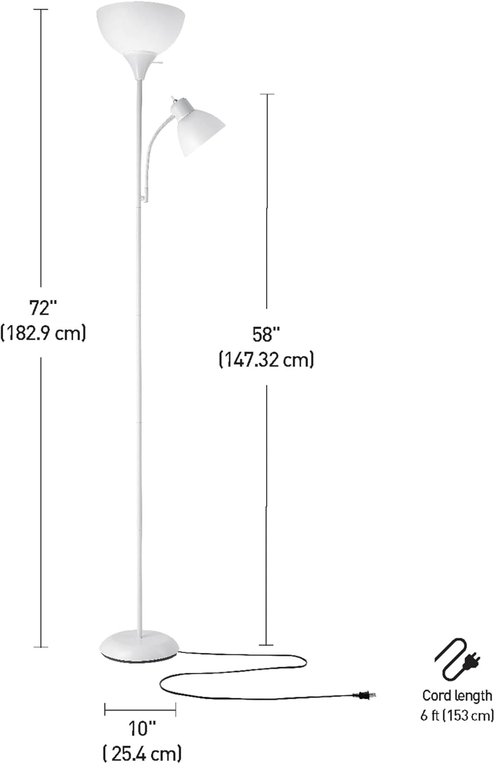 Create layered, flexible lighting for your home with the Globe Electric 72-Inch Torchiere Floor Lamp. Finished in matte white and paired with frosted shades, this two-in-one lamp offers both ambient illumination and focused task lighting. The upward-facing torchiere brightens living rooms, bedrooms, or offices with soft, even light, while the adjustable gooseneck reading arm directs illumination exactly where you need it. Dual independent switches make it easy to control each light separately, and along with the torchiere’s three-step dimmer, provides ultimate versatility for any space. Compatible with E26 base bulbs (sold separately), including LED, incandescent, or smart options, this tall floor lamp combines modern functionality with minimalist style.