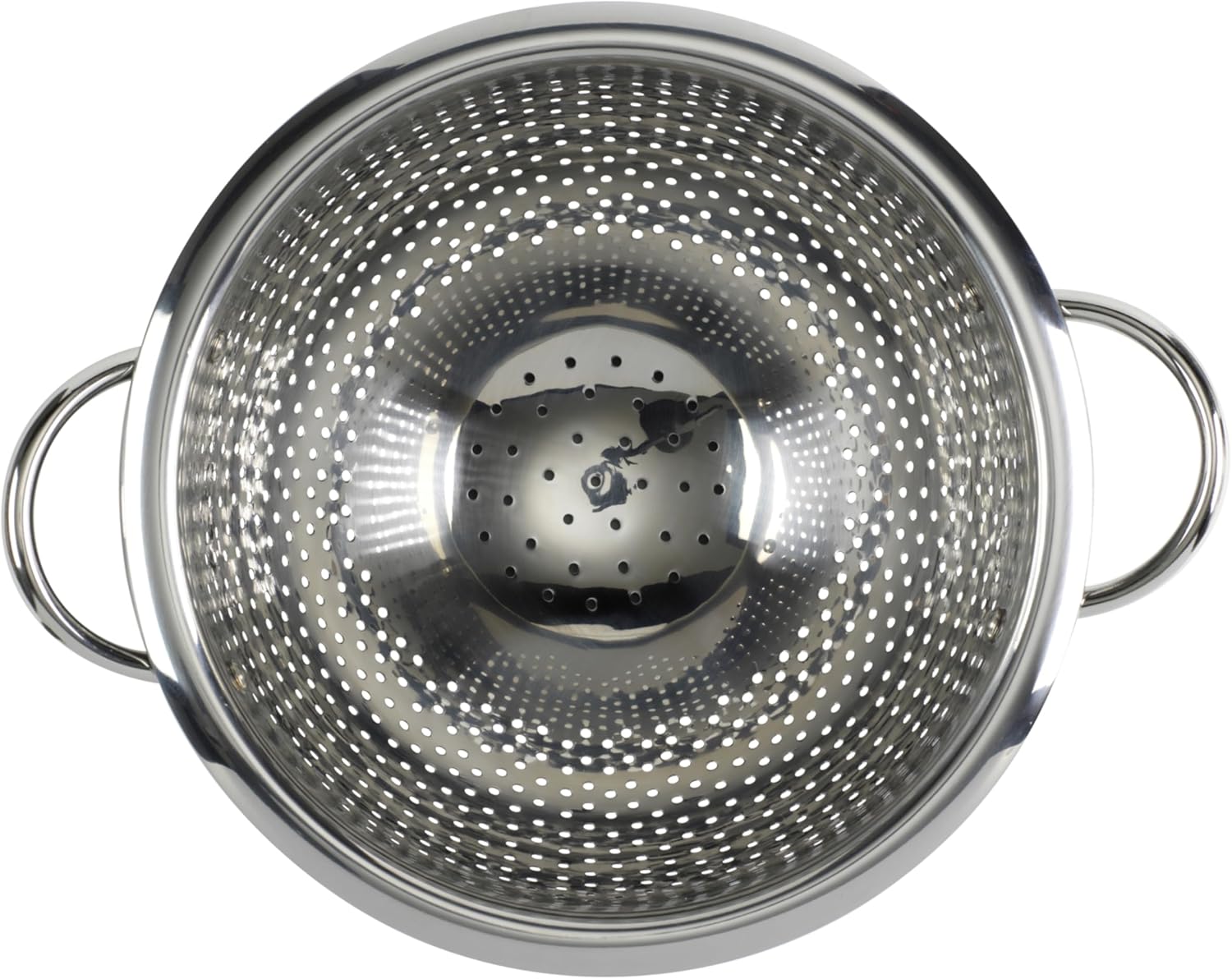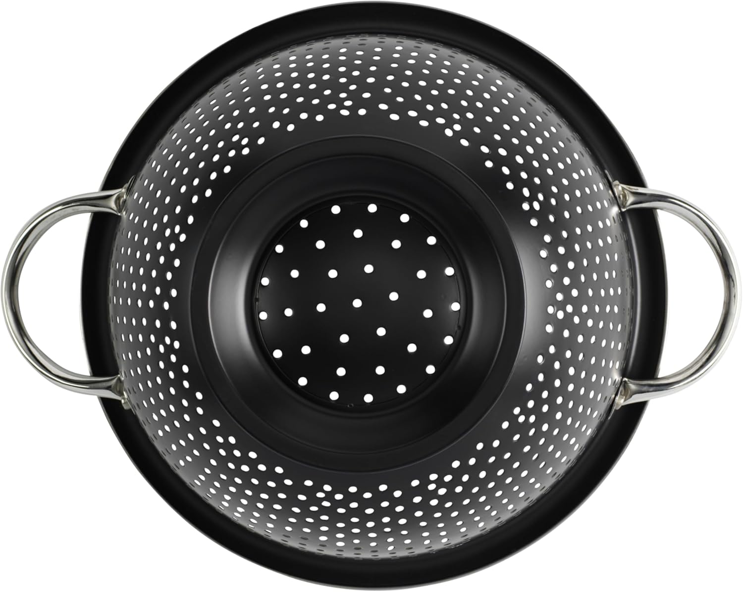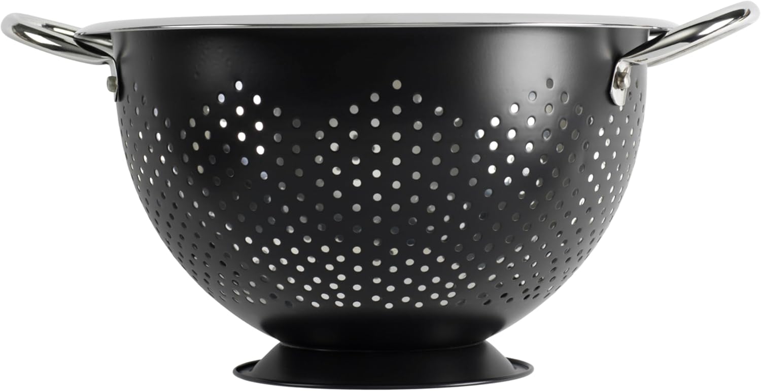 Our GoodCook Gourmet Colander is a 5 quart large capacity colander capable of washing all your fruits or vegetables. This stylish stainless steel colander has a bold black exterior that looks equally handsome resting on your countertop holding a bowl of lemons as it does rinsing out your pasta. The easy to grab handles make transporting hot ingredients easy and safe, while the elevated foot keeps the colander steady and off the surface. An efficient drain hole pattern works quickly to strain water.