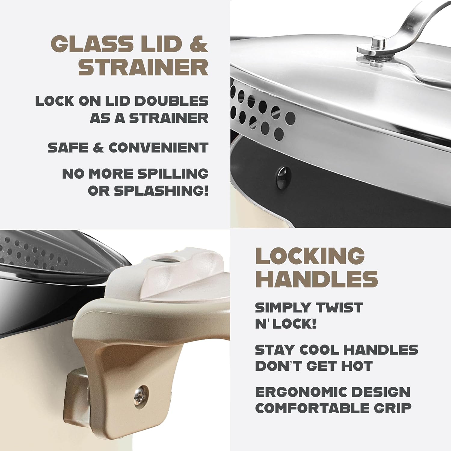 GOTHAM STEEL 5 Qt Ceramic Stock Pot Multipurpose Pasta Pot with Strainer Lid & Twist and Lock Handles, Nonstick Ceramic Pot for Soup, Spaghetti, Rice, Pots for Kitchen, Dishwasher Safe – Cream