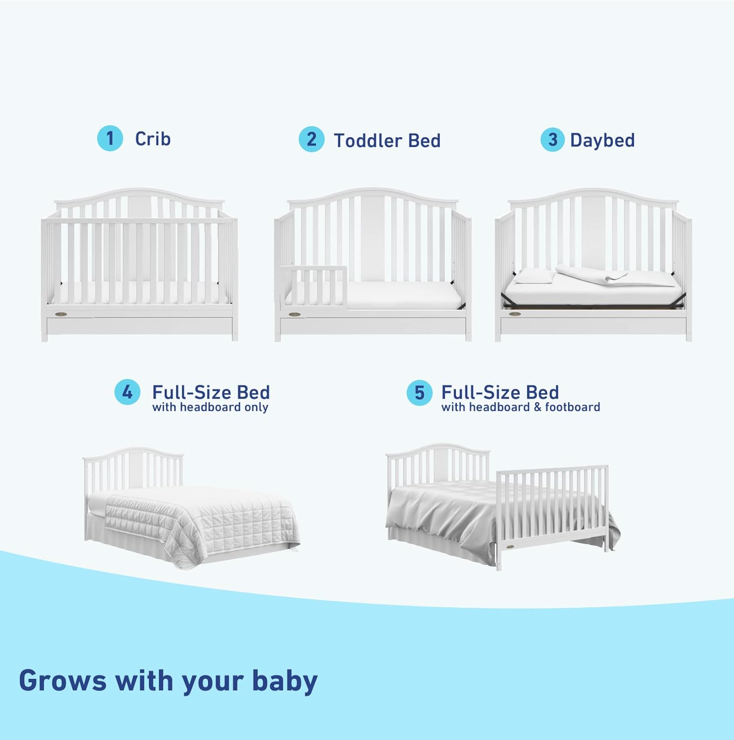 4-IN-1 CONVERTIBLE CRIB WITH DRAWER: Converts from baby crib (mattress sold separately) to toddler bed (compatible with 1 or 2 toddler guardrails, each sold separately), daybed, and full-size bed with headboard & optional footboard (compatible full-size conversion kit sold separately)