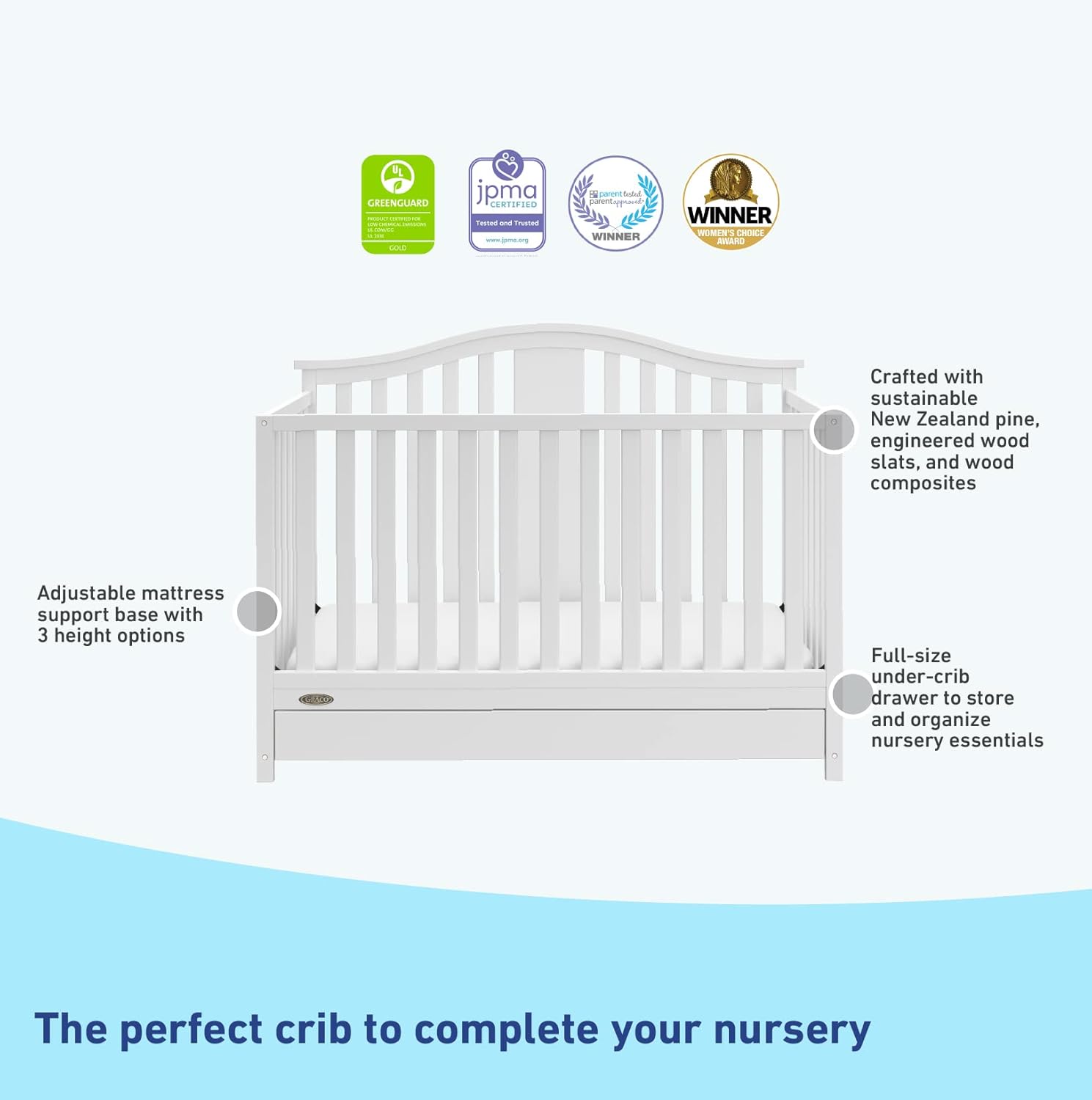 The Graco Solano 4-in-1 Convertible Crib with Drawer combines classic looks with the added convenience of a space-saving storage drawer, allowing you to conveniently store and organize your most important nursery essentials. Designed to adapt to your growing baby, the Graco Solano is equipped with a 3-position adjustable mattress support base, and can convert into a daybed, toddler bed, and full-size bed. JPMA certified and compliant with all applicable ASTM International and CPSC safety standards, the Graco Solano 4-in-1 Convertible Crib with Drawer is made of high-quality pine wood and composites, is available in multiple baby-safe, non-toxic finishes, and is backed by a 1-year limited manufacturer’s warranty. To complete your Graco crib, consider the Graco Deluxe Foam Crib & Toddler Bed Mattress – awarded the 2020 Women’s Choice Award for 9 out of 10 Customer Recommended Crib & Toddler Mattress.