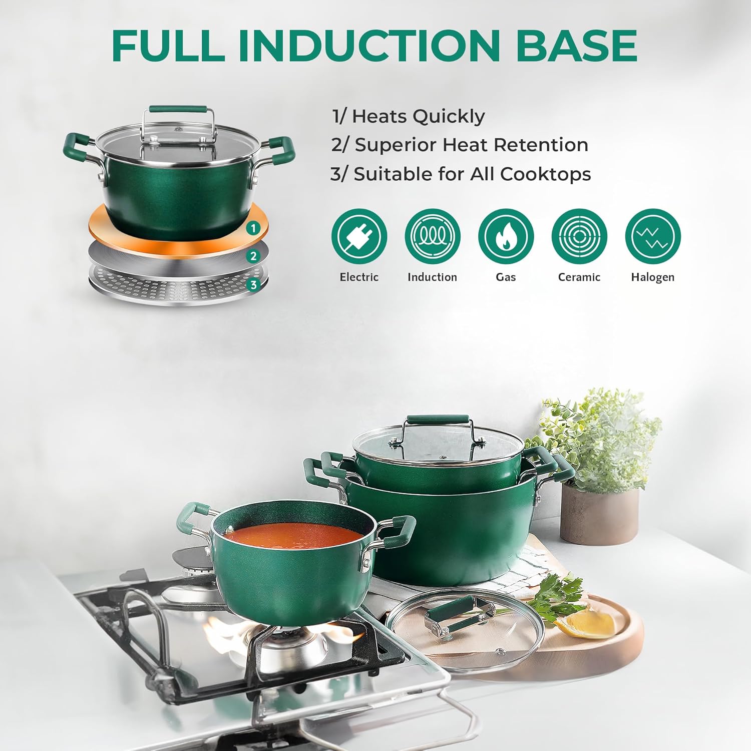 Granitestone Green Pots and Pans Set Nonstick, 6 Stackable Piece Cooking Pots Set, Kitchen Pots, Non Stick Coating, 5qt 3qt & 1.5qt Pots with Lids, Stay Cool Handles Dishwasher Safe 100% Toxin Free