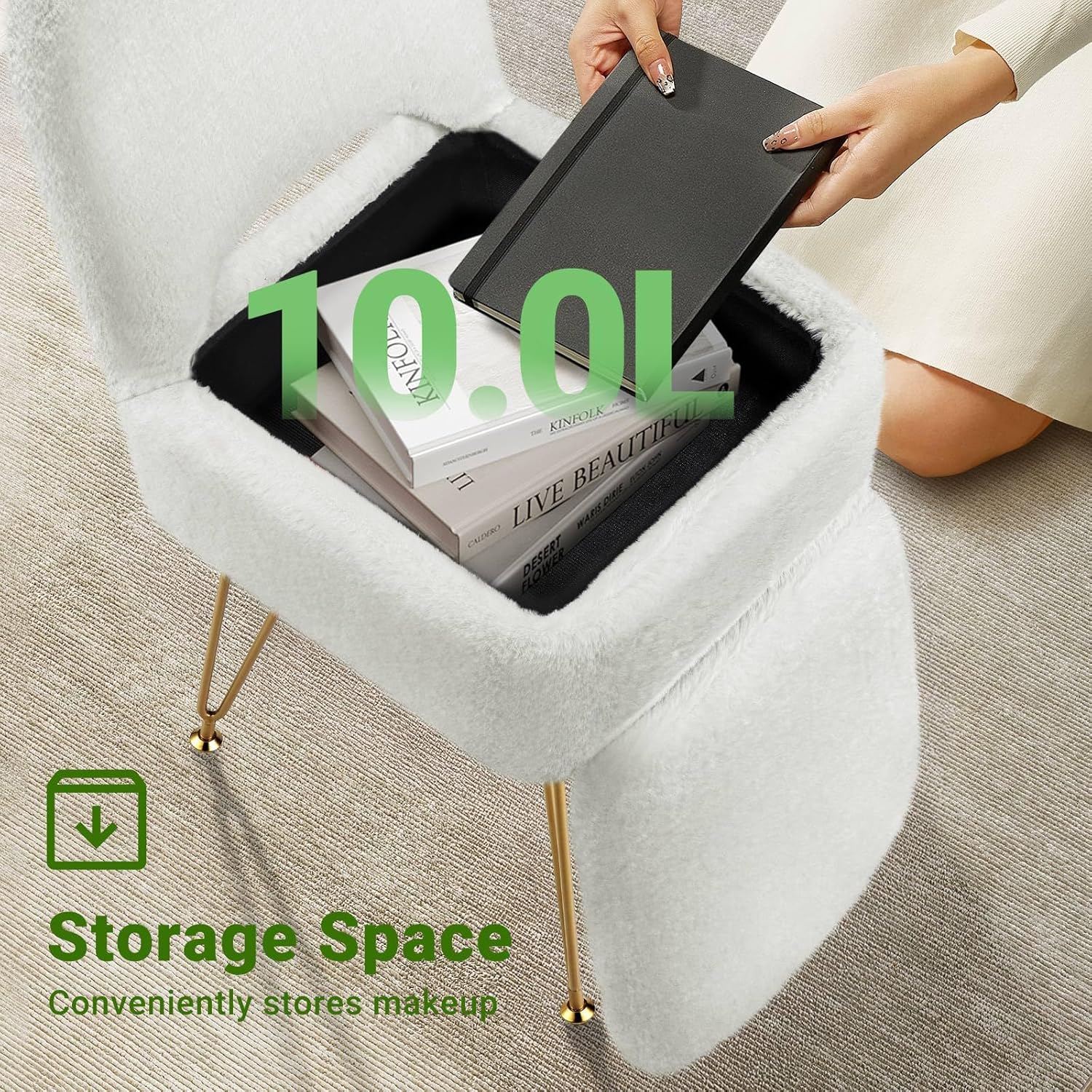 GREENSTELL Small Vanity Stool Chair with Storage and Folding Back, 13.4″ x 15″ x 30″ Square Faux Fur Soft Ottoman, 4 Metal Legs with Anti-Slip Feet, Furry Padded Seat for Makeup, Bedroom, White