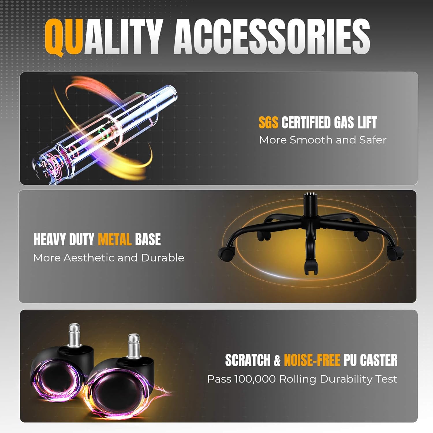 High Quality Material: Common gaming chairs are equipped with plastic legs generally to save costs, but we still insist on applying the same material as the built-in metal frame. No fear of high or low temperature, no fear of the sunshine, it will not rust and break. The gaming chair surface is made of highly breathable mesh fabric, which has good heat dissipation. Even on a hot summer day, sitting in a chair will not feel stuffy