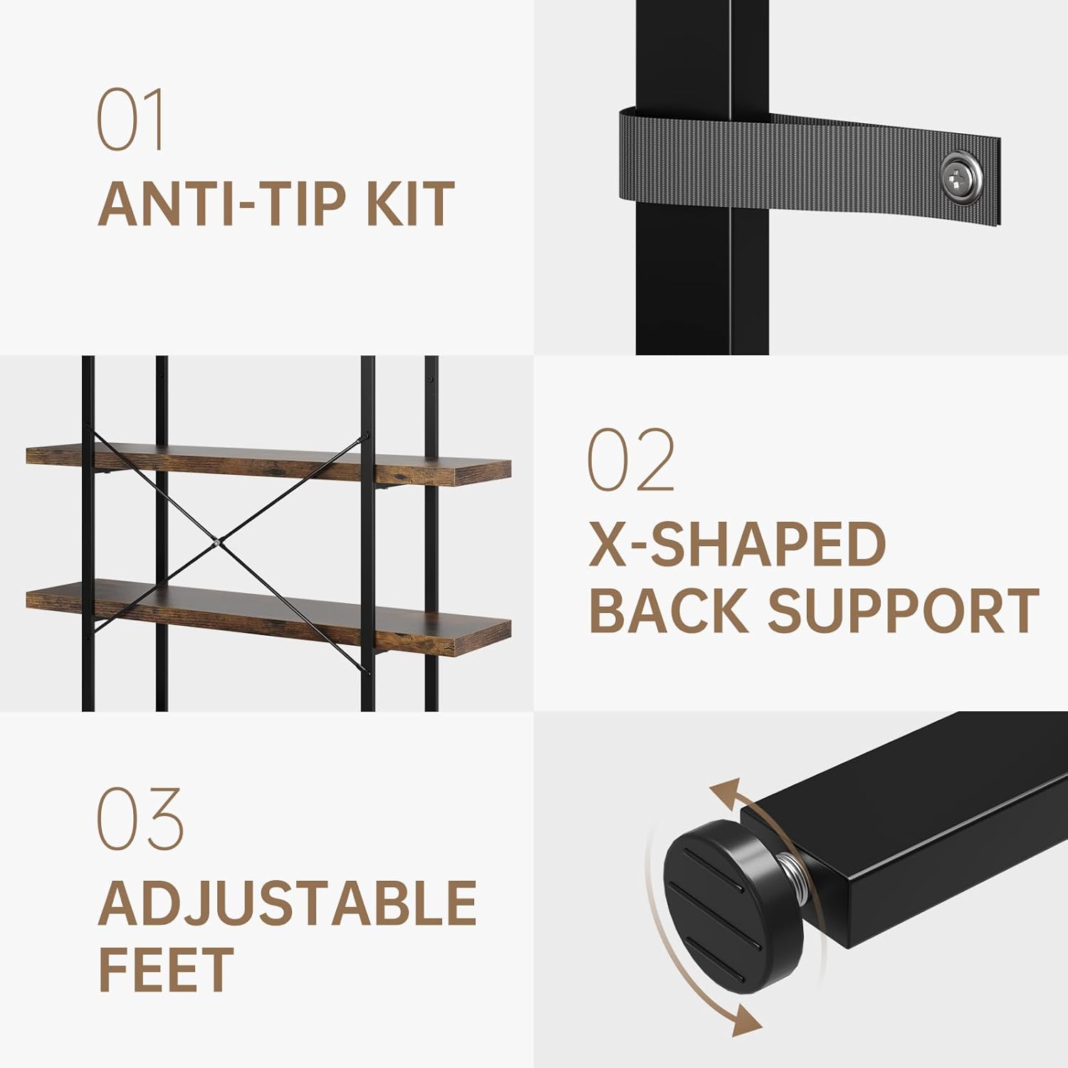 Stable and Durable Construction: Capable of holding heavy items securely, this bookcase features a matte black steel frame with X-shaped support, adjustable feet, and two anti-tip devices, ensuring enhanced stability and durability for your belongings