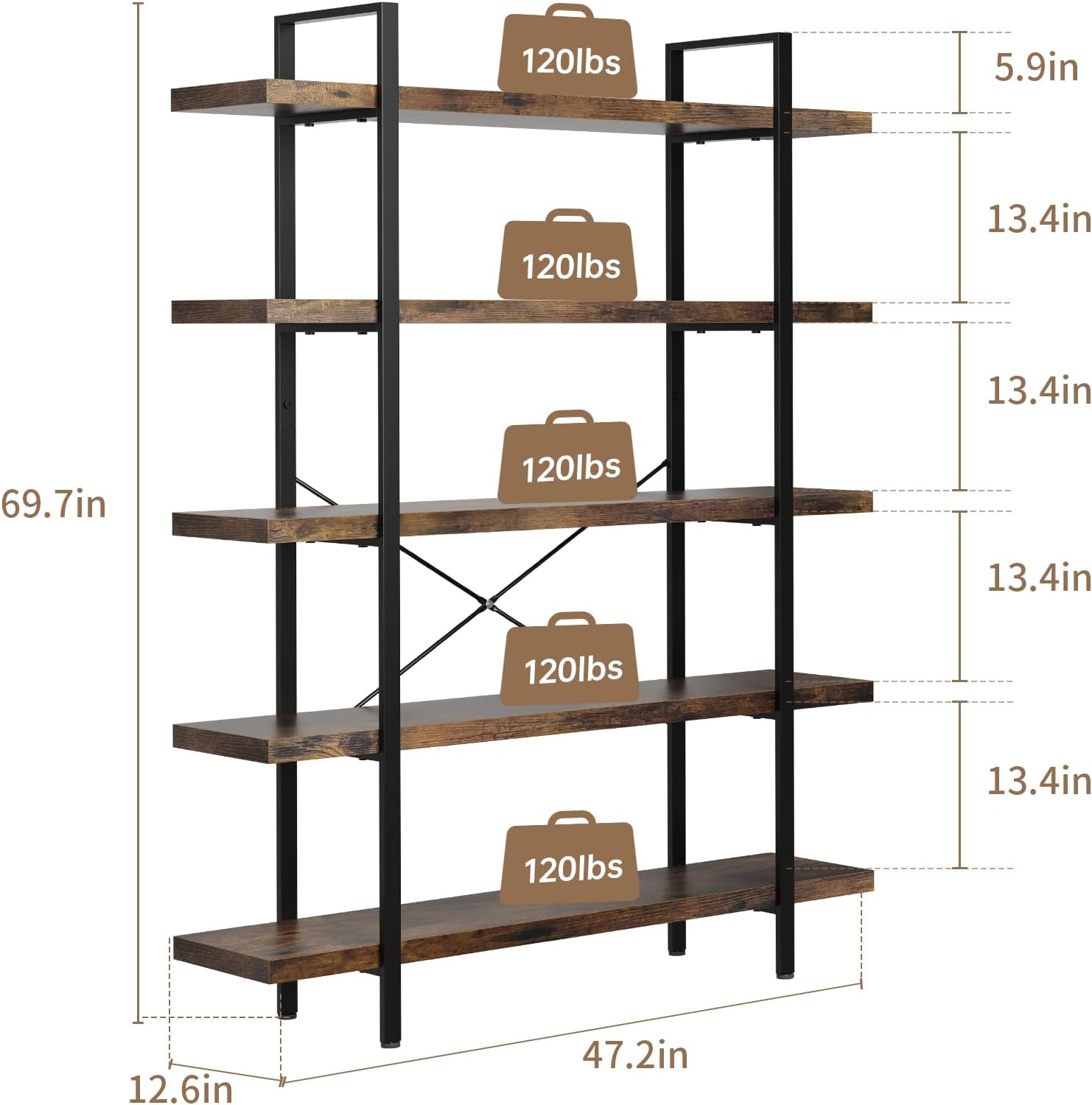 Heavy Duty 5-Tier Industrial Bookcase, 47″ Wide Wood Bookshelf for Home Office, 120lbs Shelf Capacity, Rustic Open Shelving Display with Reinforced Horizontal Shelf for Living Room Bedroom