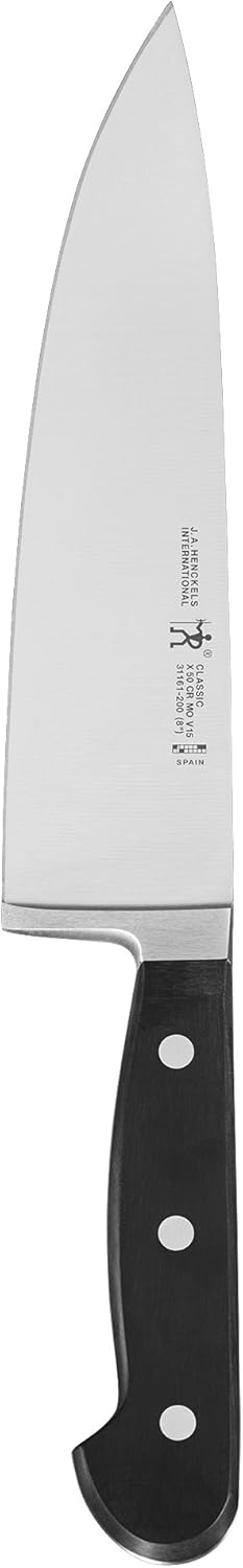 PRODUCT DESCRIPTION Experience confidence with each cut. The Henckels CLASSIC 8″ Chef’s Knife boasts a precision, fine-edge blade that is honed for long-lasting sharpness. Chop potatoes, dice apples, mince shallots and slice salmon effortlessly – this kitchen workhorse is up for almost any task.High-quality German stainless steel strengthens this durable, Spanish-made knife. With a seamless transition from blade to handle, the knife’s fully forged construction provides balance as the traditional triple-rivet handle encourages tireless cutting.Henckels makes essential kitchen tools every home chef needs. From steak knives to spatulas, every product boasts high quality at an exceptional value. Created in 1895 by Zwilling J.A. Henckels, this value-driven brand guarantees the same durability, design and ease of use for which the global company is known. Equip your kitchen with expertise with Henckels. AMAZON.COM A good chef’s knife becomes your daily kitchen companion. It’s used for everything from prepping steaks for the grill to finely mincing onions, and chances are you’ll reach for it every time you cook–so it better be good. This lower-priced line from Henckels is a great value: excellent quality knives with their standard lifetime warranty. There’s good balance, and the handles are a shade heavier than other lines, which some cooks will prefer. The 8-inch blade length is the most practical for multipurpose use, and regular sharpening will keep the stainless-steel blade razor-sharp. It’s only minimally flexible, which makes it a great choice for vegetables such as potatoes and turnips. While it’s dishwasher-safe, unless it needs sanitizing after use with raw meat, it’s often easier to hand wash. –Jill Lightner