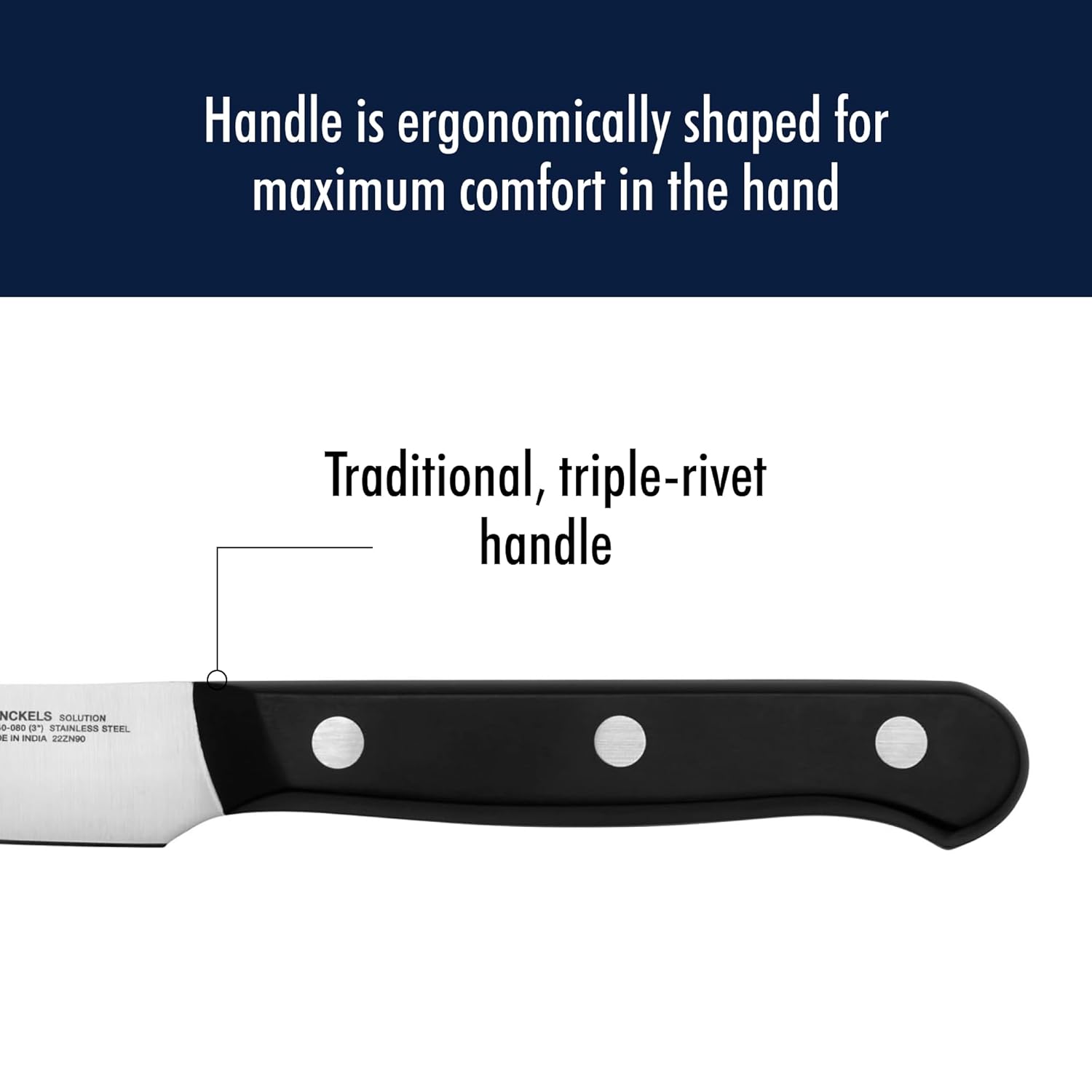 Equip your kitchen for less with these essential knives. The 7-piece knife block set features all the knives you need to set your kitchen up right. From the paring knife for smaller scale jobs to the chef’s knife for slicing and dicing, this set contain the key knives for all kitchen jobs, along with a sturdy set of kitchen shears. The set comes housed in a handsome, compact wood knife block. Honed for long-lasting sharpness, these fine-edge blades make fast work of kitchen prep. Since 1895, Henckels has been making high quality knives at an exceptional value. Solution knives are designed to tackle every kitchen task. Fabricated from high-quality stainless steel, the single-piece, precision-stamped knife blades are lightweight without sacrificing strength and durability. Curved for comfort, the break-proof, triple-rivet handles are pleasant to grip, giving you the control you need to slice through tougher cuts with ease. This ergonomic handle lets you enjoy maximum maneuverability and fatigue-free cutting. Set includes 4-inch Paring Knife, 5-inch Serrated Utility Knife, 6-inch Utility Knife, 8-inch Bread Knife, 8-inch Chef’s Knife, Kitchen Shears and 6 slot Hardwood Block.