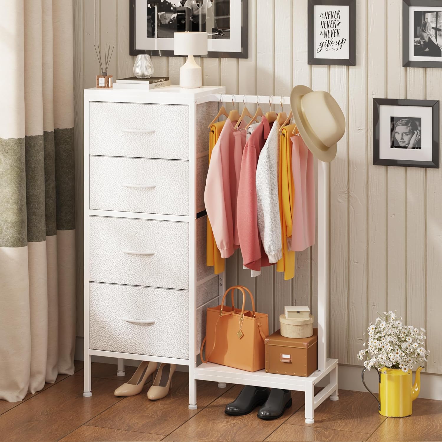 【Built for Small Spaces】Narrow footprint saves room space while delivering wardrobe + dresser storage. Multifunctional dresser&clothes rack adds a touch of class to bedrooms, dorm, small-apartment, nursery and entryways, small closet alternative