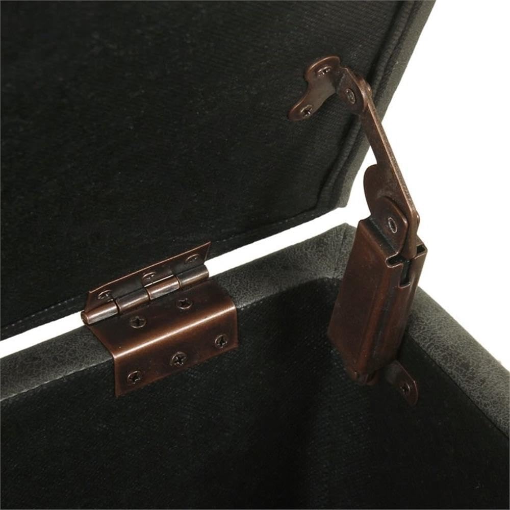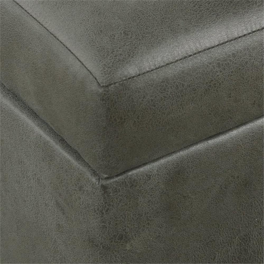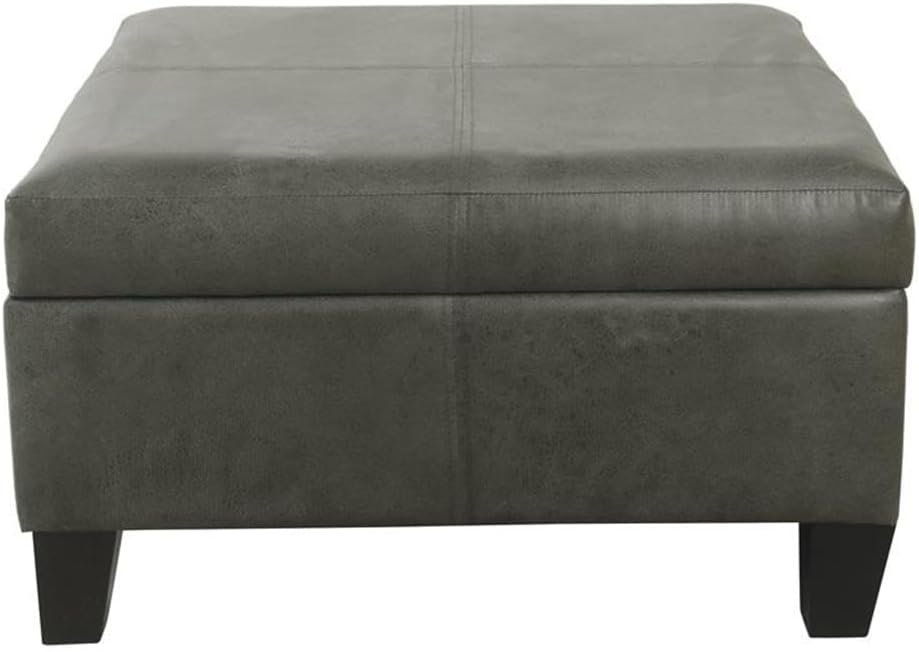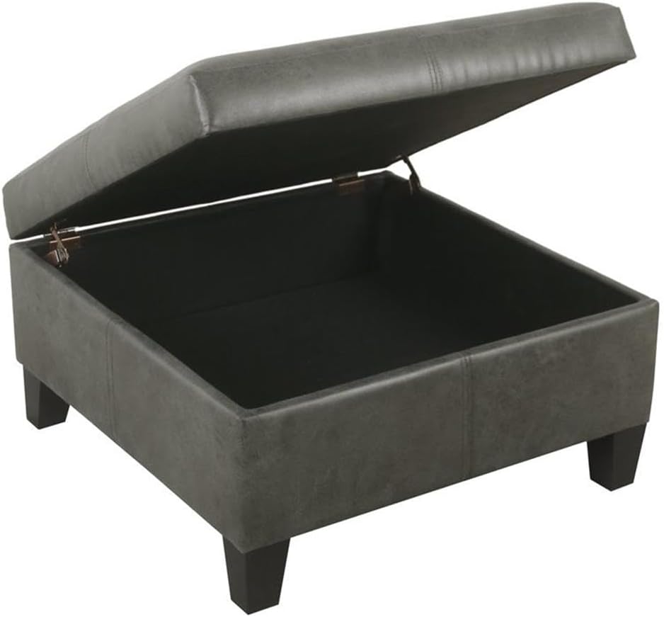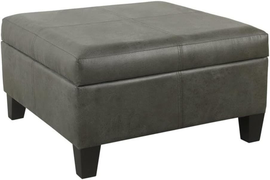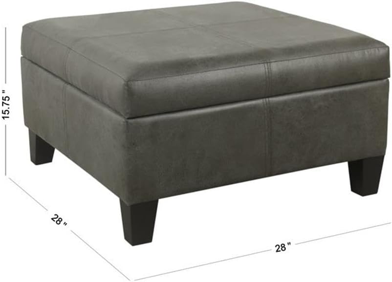 This large faux leather storage ottoman offers an easy and stylish storage solution for pillows, blankets, books or toys. The rich gray faux leather lupholstery on this square ottoman makes it suitable as a coffee table in a living room or family room, or as extra seating in a study. The hinged lid allows easy access to items nearby but out of view. With stitching details for added interest and tapered wood legs in a black finish, this large storage ottoman offers a stylish storage and seating solution for years to come. Easy to assemble and maintain.Please note that fabric and wood colors may appear slightly different due to variations in lighting or screen settings