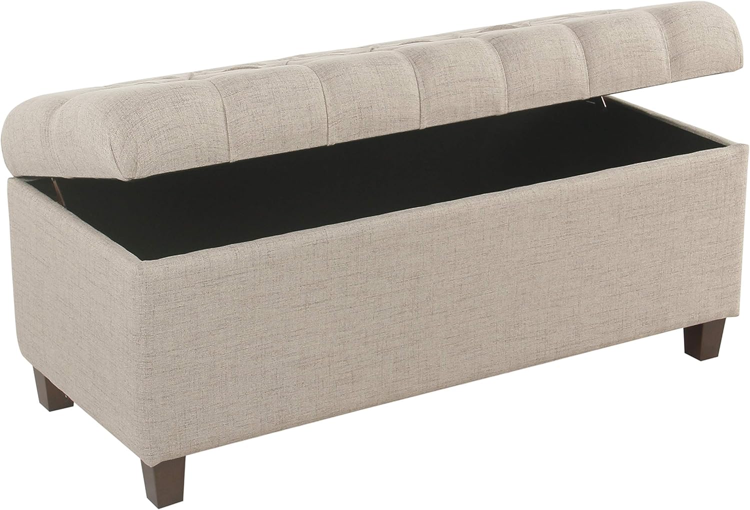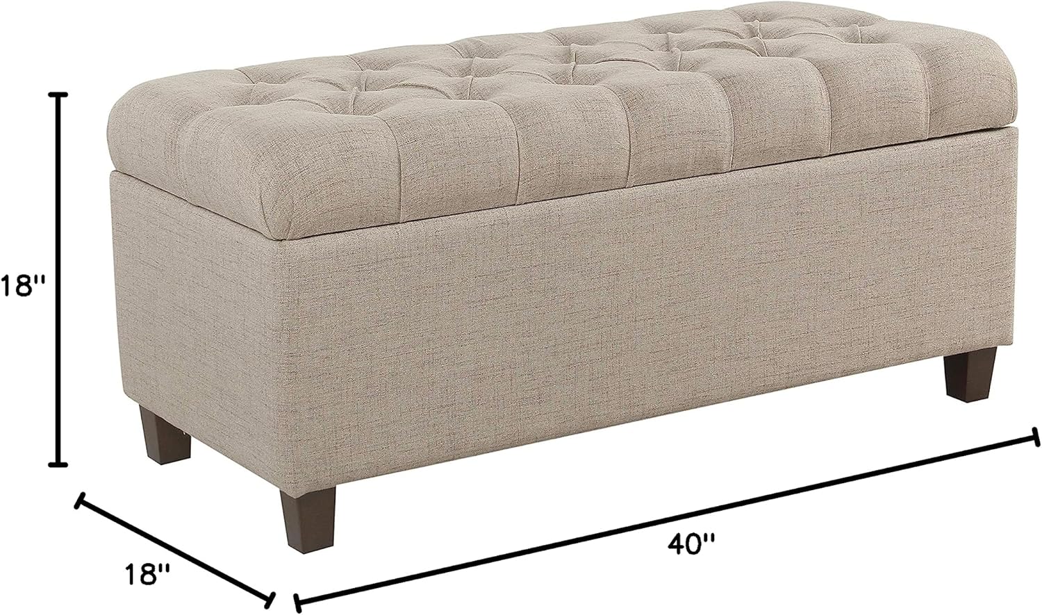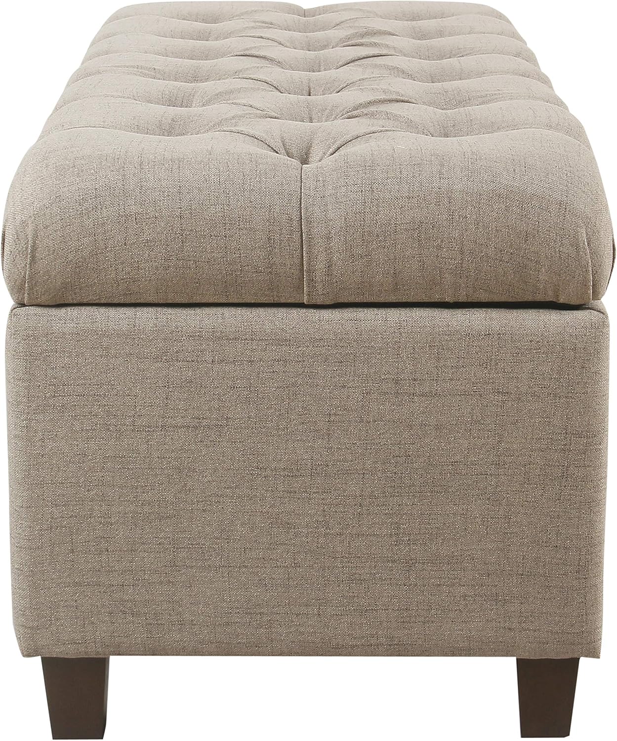 Plush yet practical, the Ainsley tufted storage bench provides a variety of home décor and storage options. Use it as a coffee table ottoman in a living room to serve guests. Put it in a family room to prop feet up after a long day. Or, place it as an end of bed Bench to store pillows and blankets when not in use. With solid wood legs in a contrasting finish, Soft textured fabric, and a hinged lid for easy access, The Ainsley storage bench is a premium addition for any home. Easy to assemble and maintain.