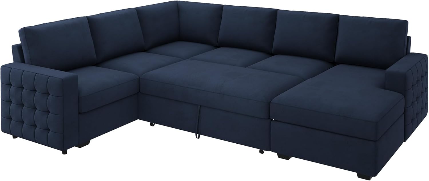 HONBAY Sleeper Sectional Couch with Pull-Out Bed Sectional Sleeper Sofa Pull Out Bed with Storage Chaise, 6 Seaters Couch for Living Room, Velvet Blue