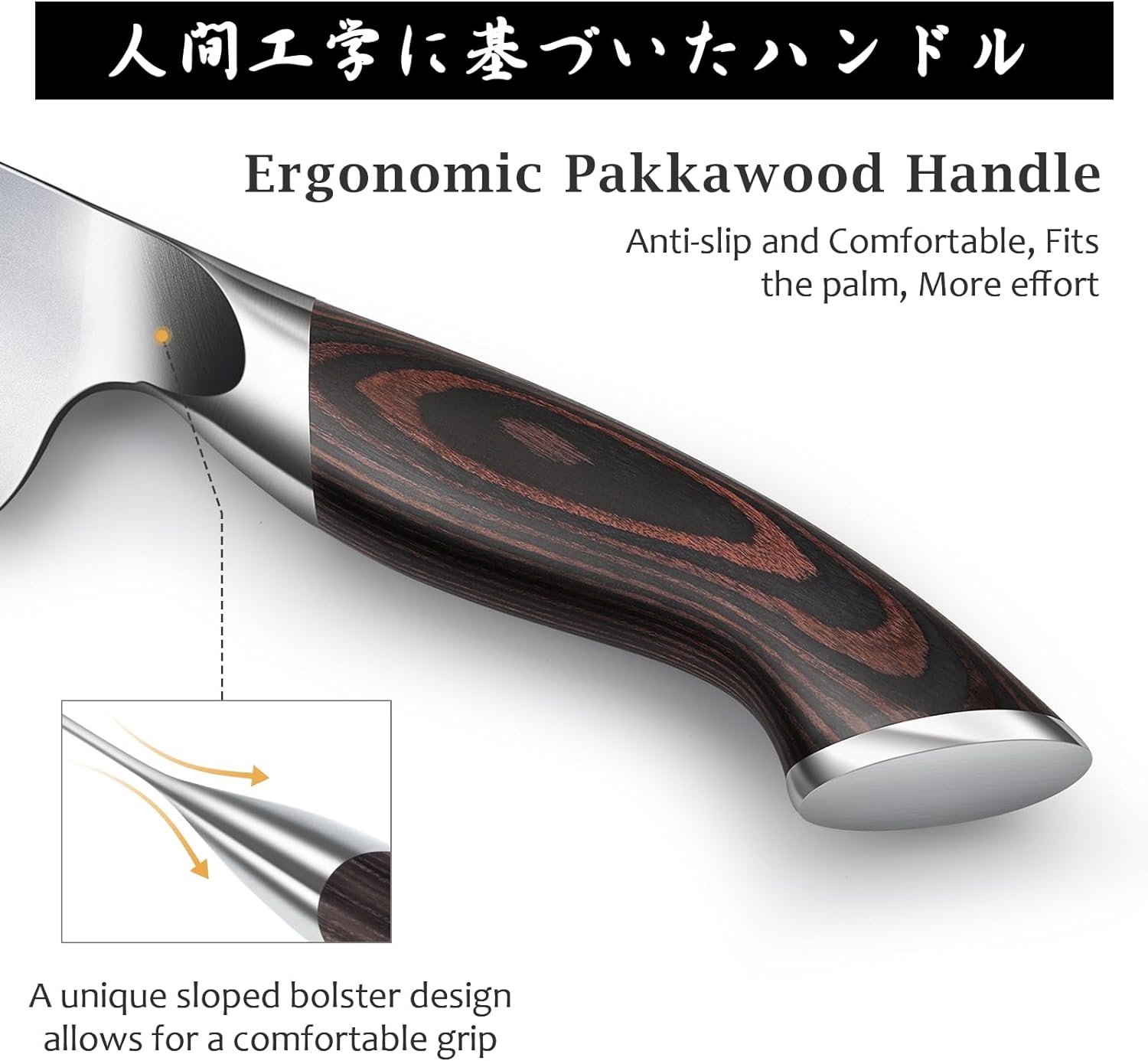 【Ergonomic Handle】The ergonomic shape can adapt to the natural holding posture of the human hand, perfectly balancing the weight of the handle and blade, reducing fatigue caused by long-term use. The pakkawood handle blends with the sharp blade for a comfortable grip.