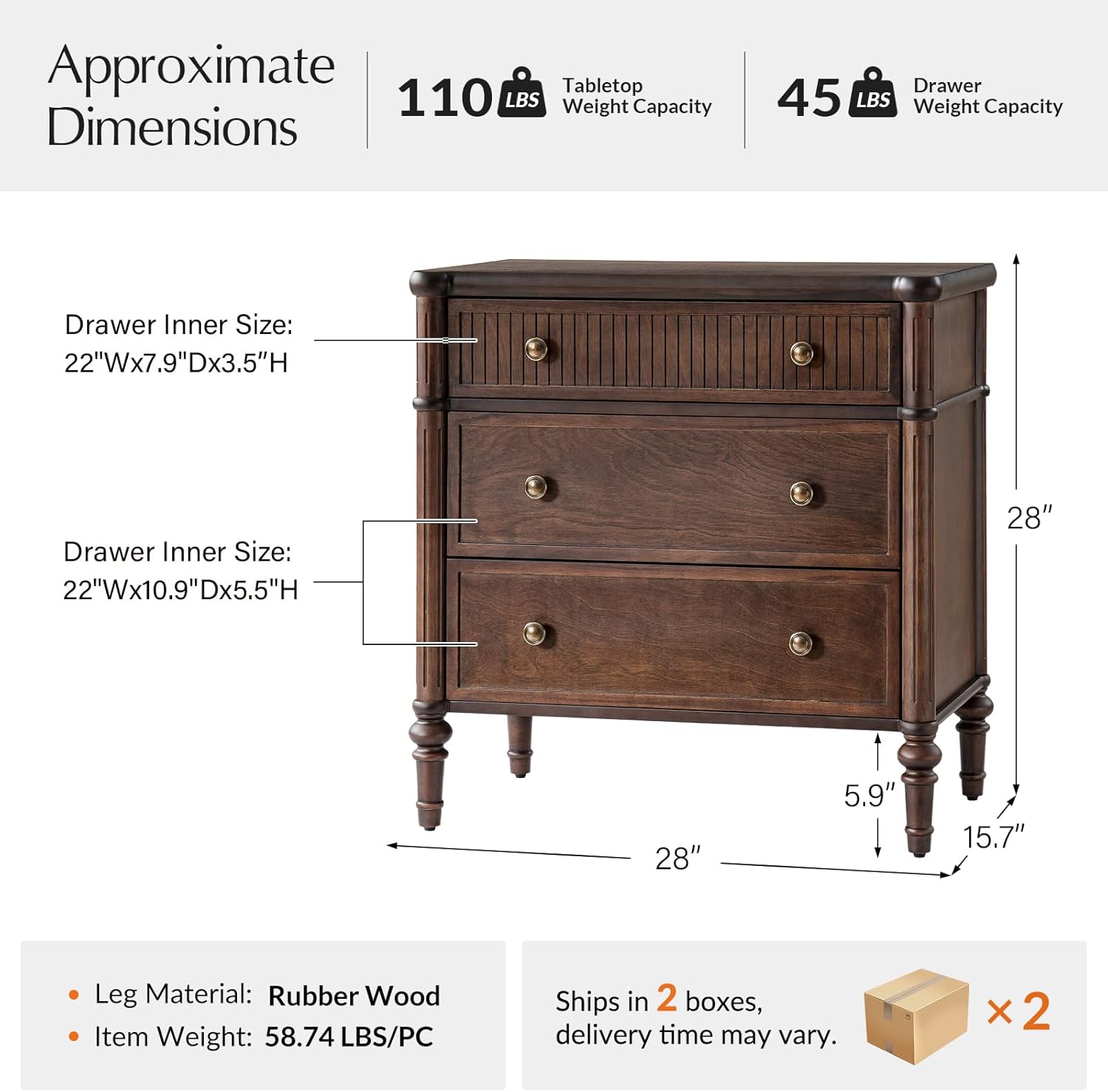 Solid Wood Construction: Natural ash wood grain top with vertical reeding + durable Paulownia wood drawers & rubber wood spindle legs.