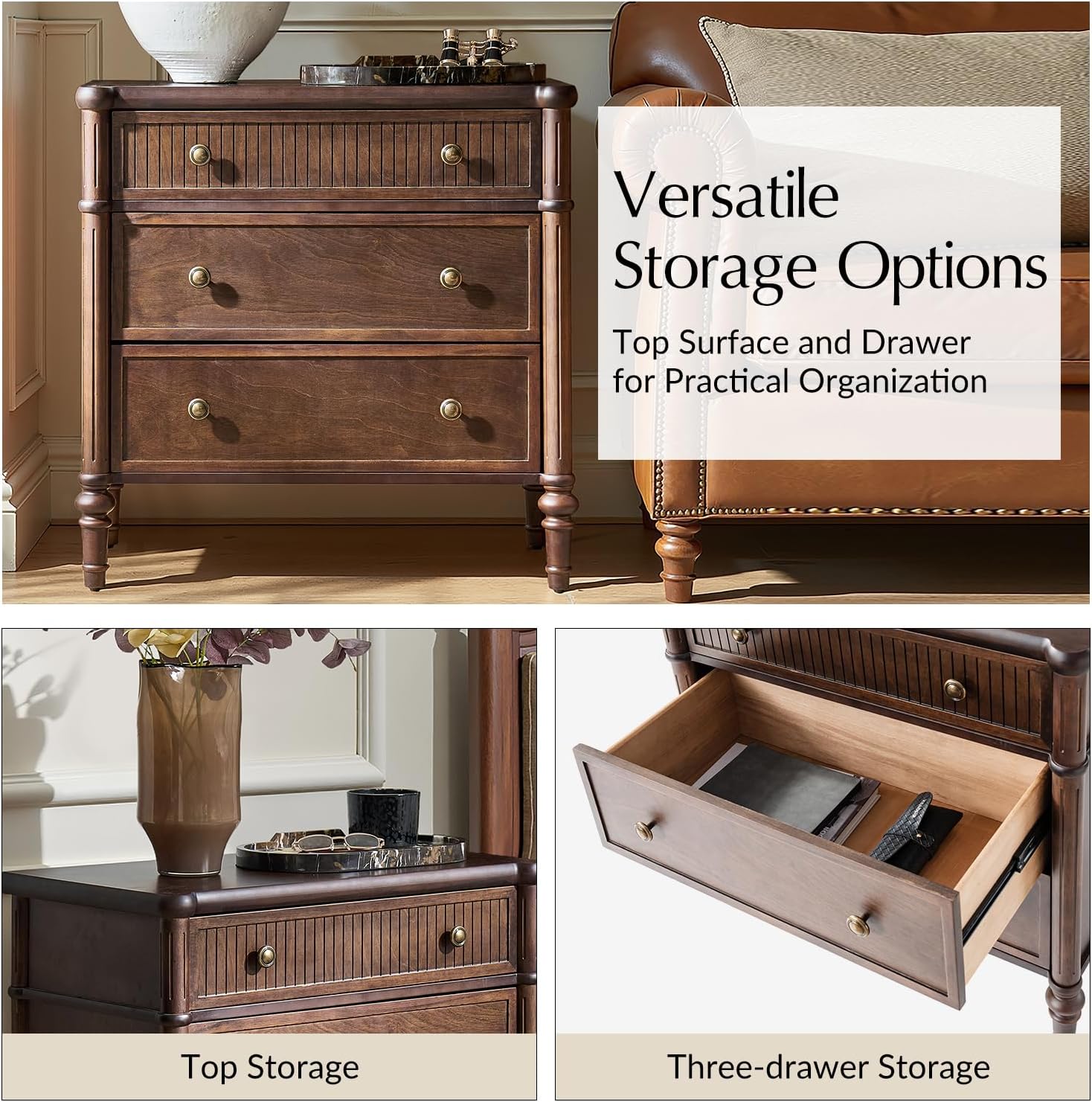 Versatile Storage Space: Offers open-top surface + 3-tier drawers (inner size: 22″W×10.9″D×5.5″H) for organized end table storage.