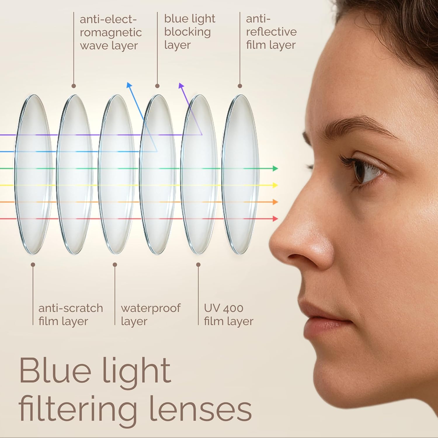 BLUE LIGHT BLOCKING: Our blue light glasses boast UV400 protection, blocking up to 99% of harmful blue rays from computer screens. Enjoy gaming, reading, or watching TV without straining your eyes or disrupting your sleep with these blue light blocking glasses