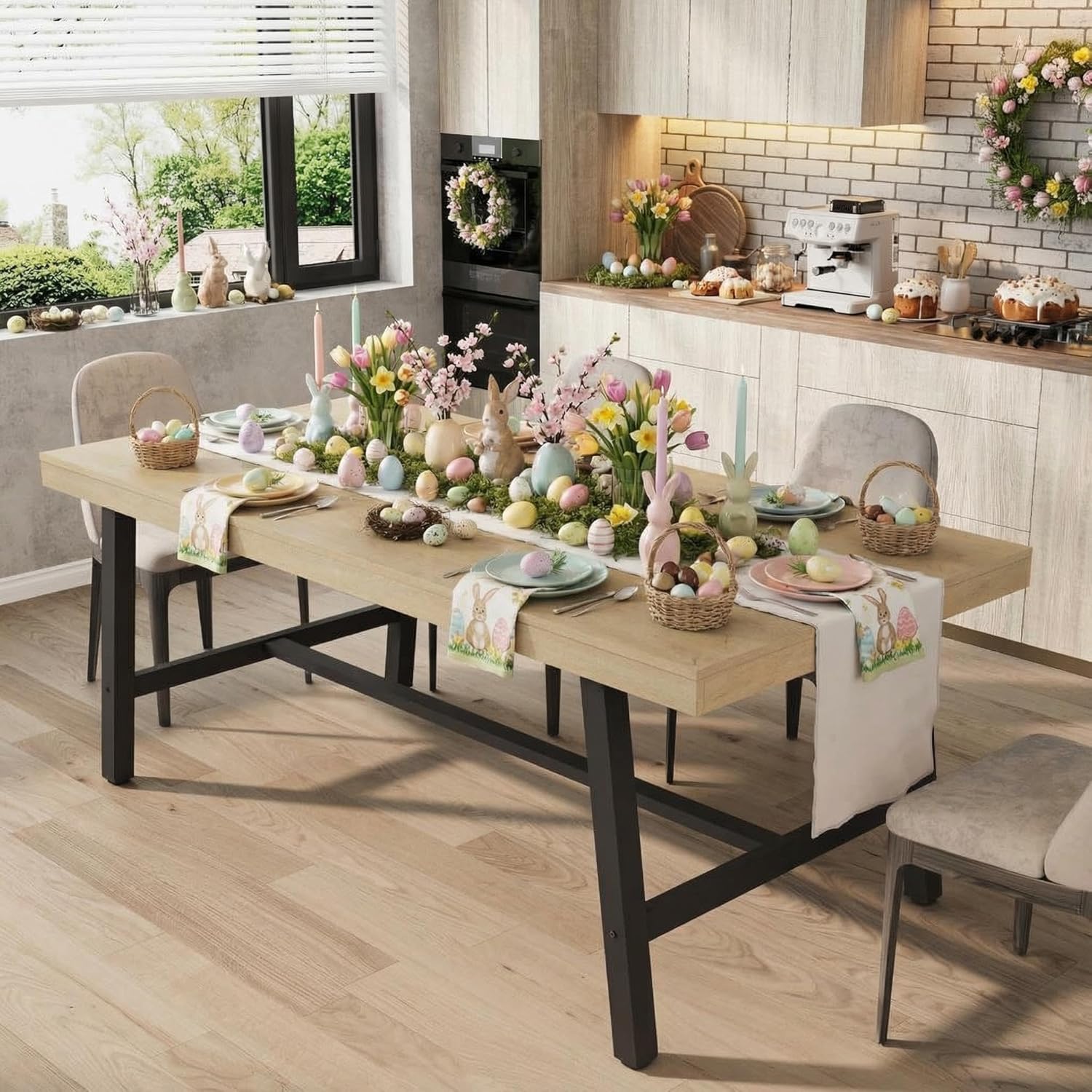 [Spacious Tabletop for Family Dining]: This large industrial dining table features a 70″L x 35.4″W x 30″H rectangle design, comfortably seating 6 to 8 people. Crafted from high-quality MDF wood with a waterproof, scratch-resistant, and easy-to-clean finish, this farmhouse dining table is perfect for family dinners, parties, or holiday gatherings.