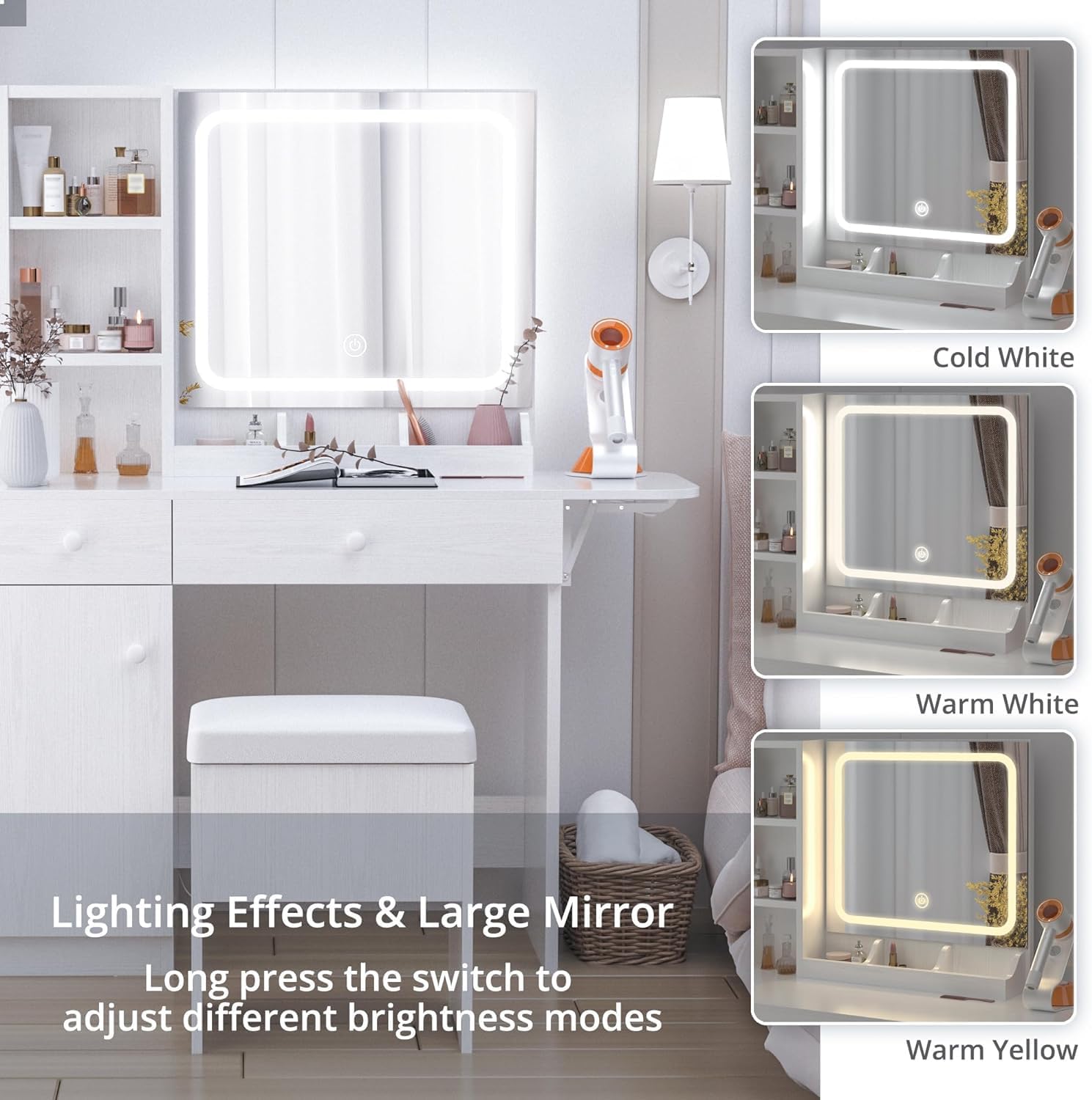 Makeup Table with Extral Large LED Light Mirror: With three modes warm, natural, and cold of the lighted mirror, adjust the brightness according to different scenes and makeup needs by long pressing the screen. add a sense of glamor and style