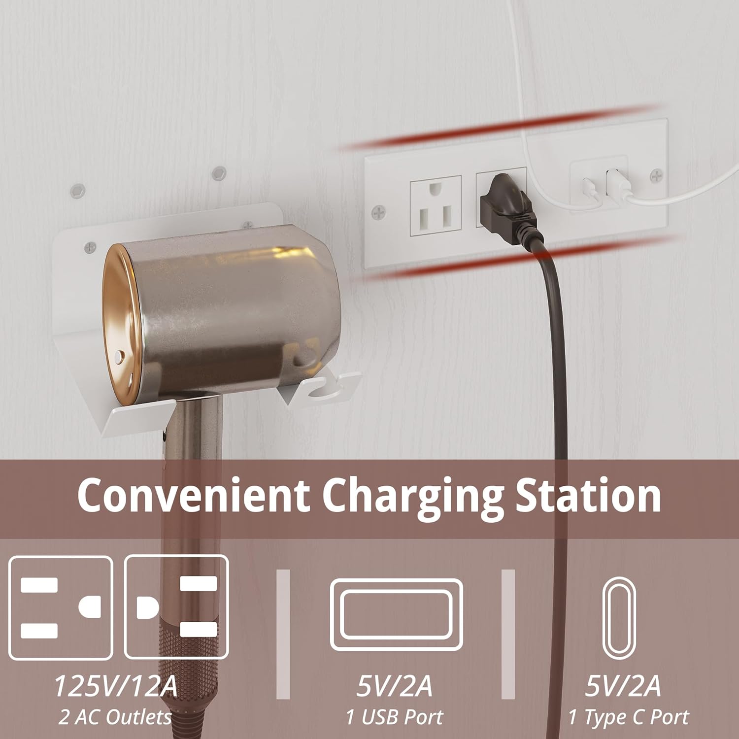 FUNCTIONAL DRESSING TABLE: This makeup vanity has a built-in charging station on the right tabletop, including 2 AC outlets,1USB and 1Type C port, it is very easy for you to charge your electronics in time. In addition, our small vanity desk provides you with a hair dryer rack to keep your hair dryer and hair curler within arm’s reach
