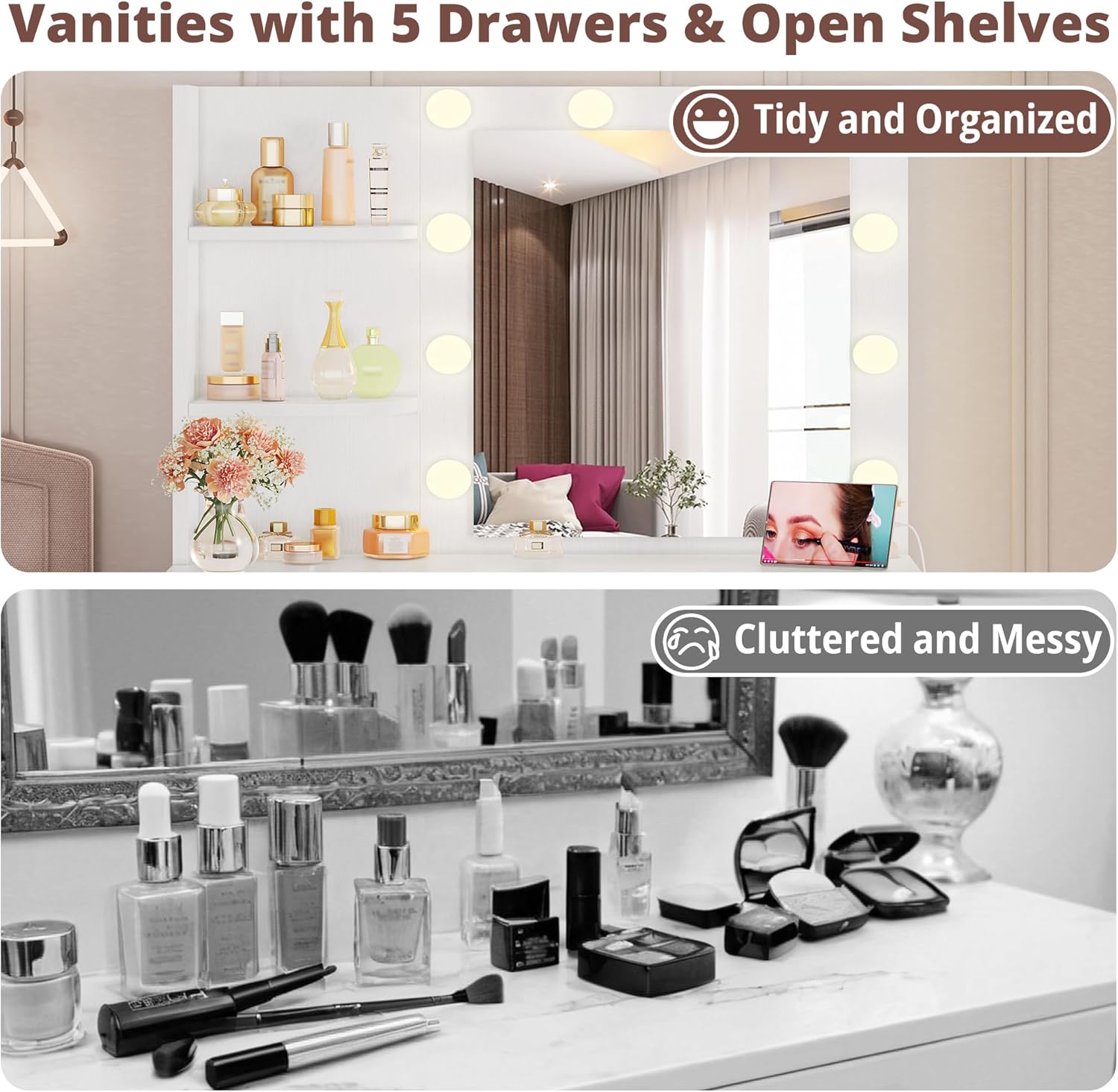 COMPACT DESIGN, LARGE CAPACITY: This vanity table, measuring 31.5”L x 15.6”W x 54”H, features 5 large drawers, a storage stool, a wide tabletop, and 3 open shelves. With ample storage space for cosmetics, perfumes, makeup brushes, and more, it’s ideal for smaller rooms. The compact design ensures it doesn’t occupy excessive space