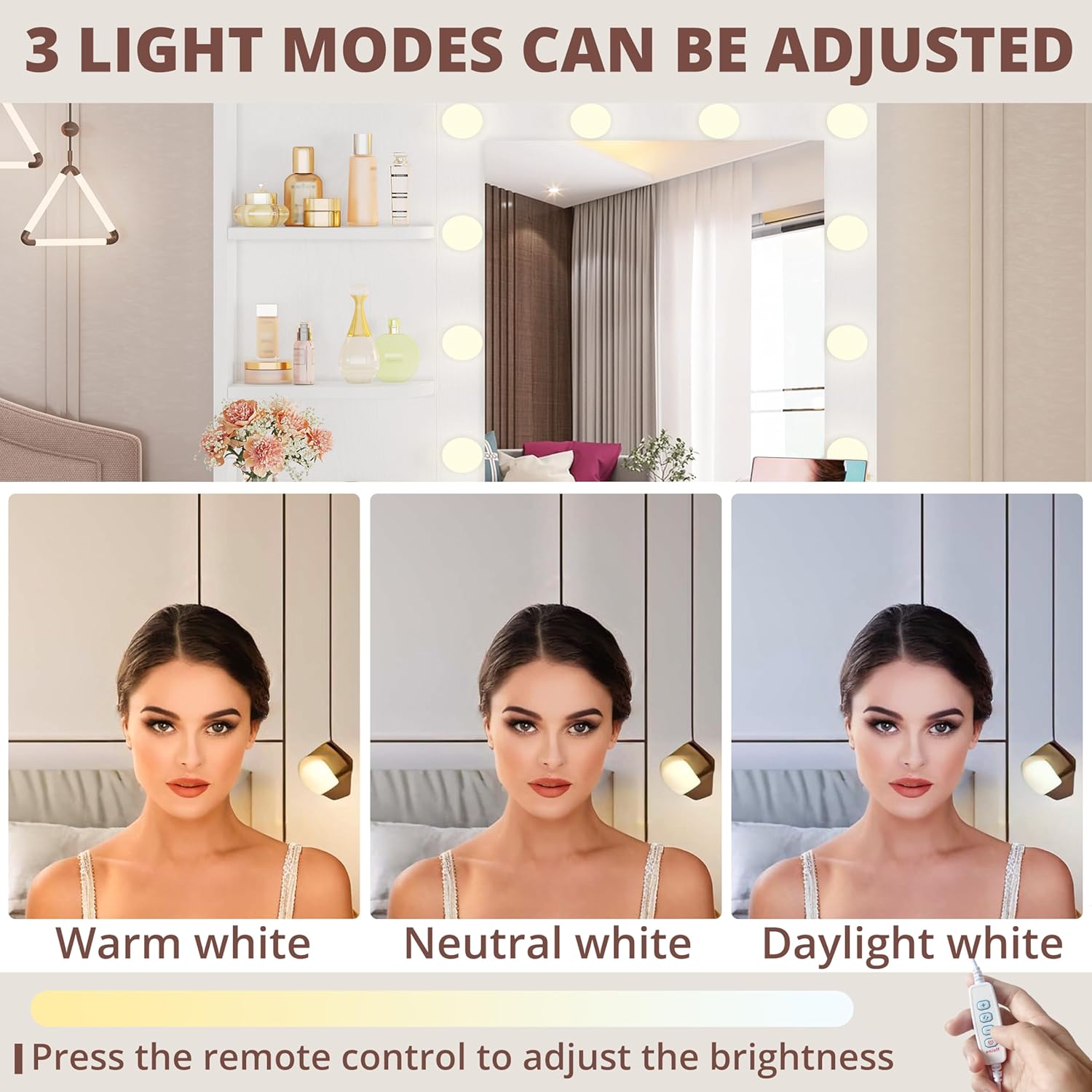 3 LIGHTING & BRIGHTNESS ADJUSTABLE: Comes with a mirror and 10 LED bulbs for the vanity desk. The brightness of the lights is adjustable with 3 colors to choose from: warm yellow, warm white and cool white, so that you can choose different light colors for different scenes and different make-up