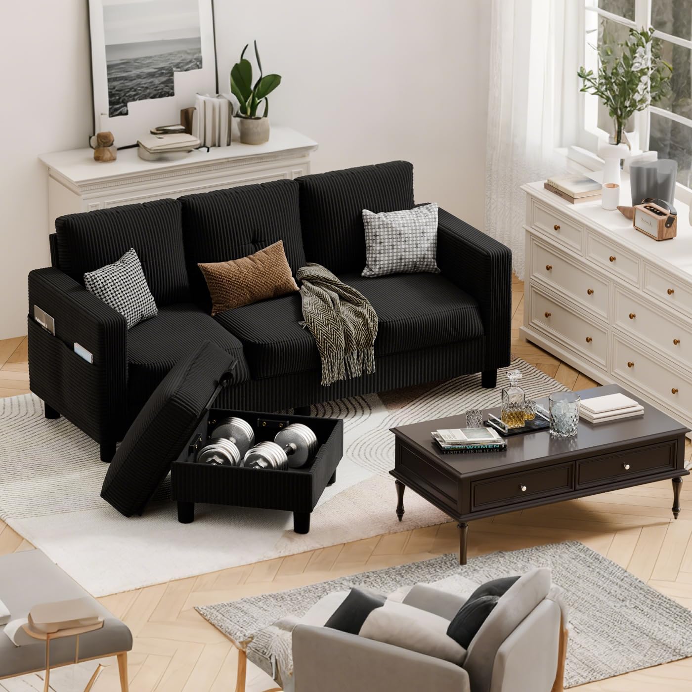 【𝑺𝒑𝒂𝒄𝒆-𝑺𝒂𝒗𝒊𝒏𝒈 𝑺𝒕𝒐𝒓𝒂𝒈𝒆】Our sectional sofas feature extra storage space inside the ottoman and convenient side pockets. You can easily store remote controls, magazines, and more within arm’s reach. Everything is organized and within easy reach.