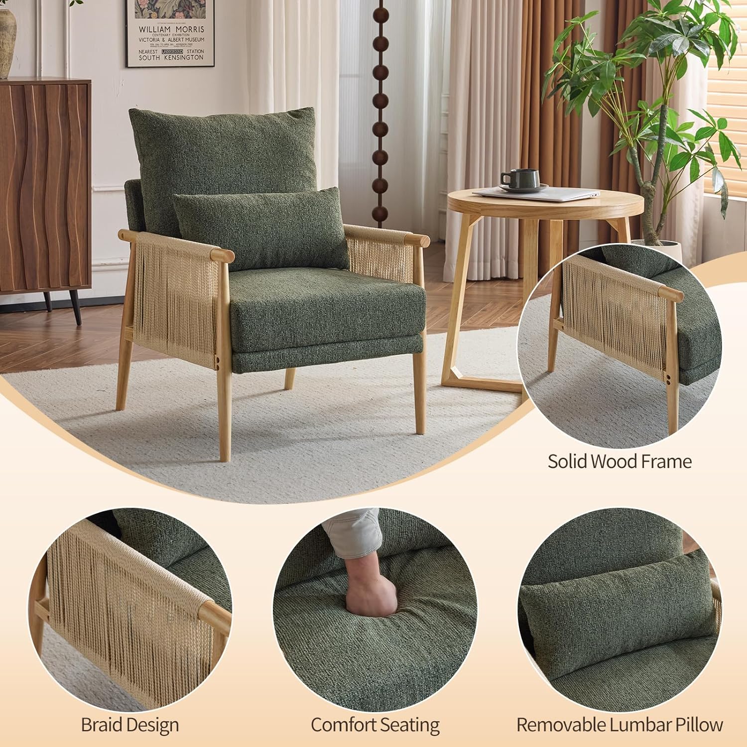 Karl home Cozy Chenille Accent Chair with Lumbar Pillow & Rattan Arms Modern Lounge Chair for Living Room, Bedroom, Reading Nook, Green