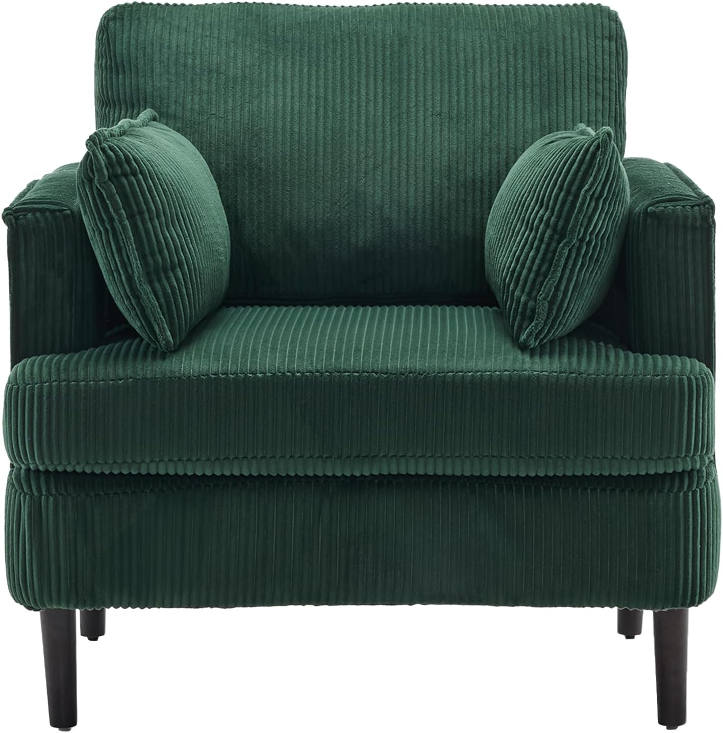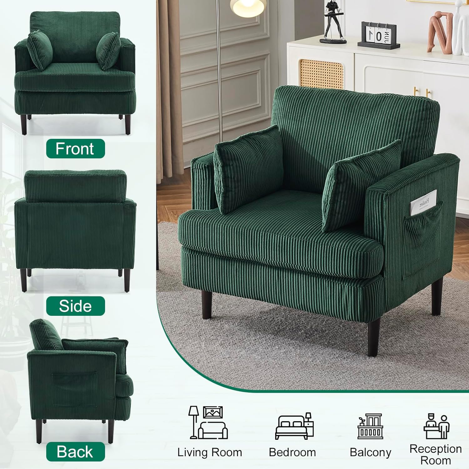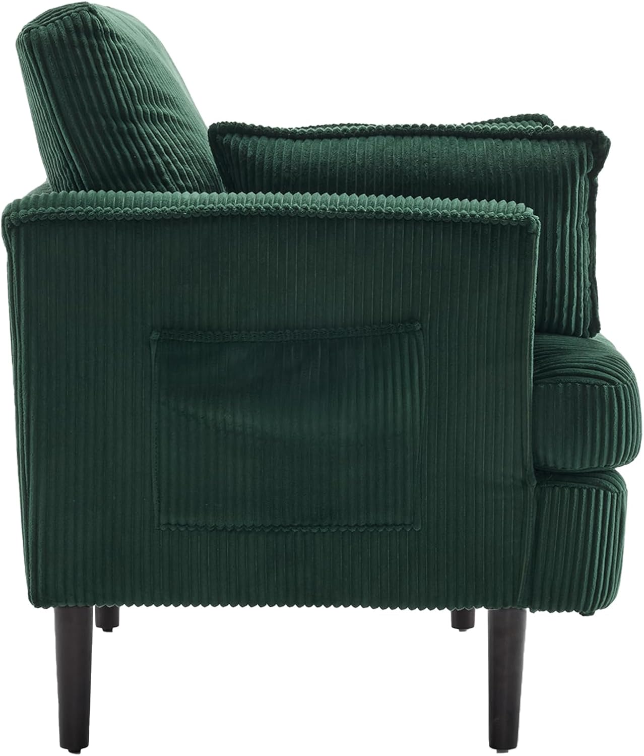 Karl home Modern Accent Chair, Corduroy Upholstered Armchair with 2 Pillow & Side Pocket, Sofa Barrel Chair with Solid Legs, Comfy Reading Chair for Living Room, Bedroom, Office, (Dark Green)
