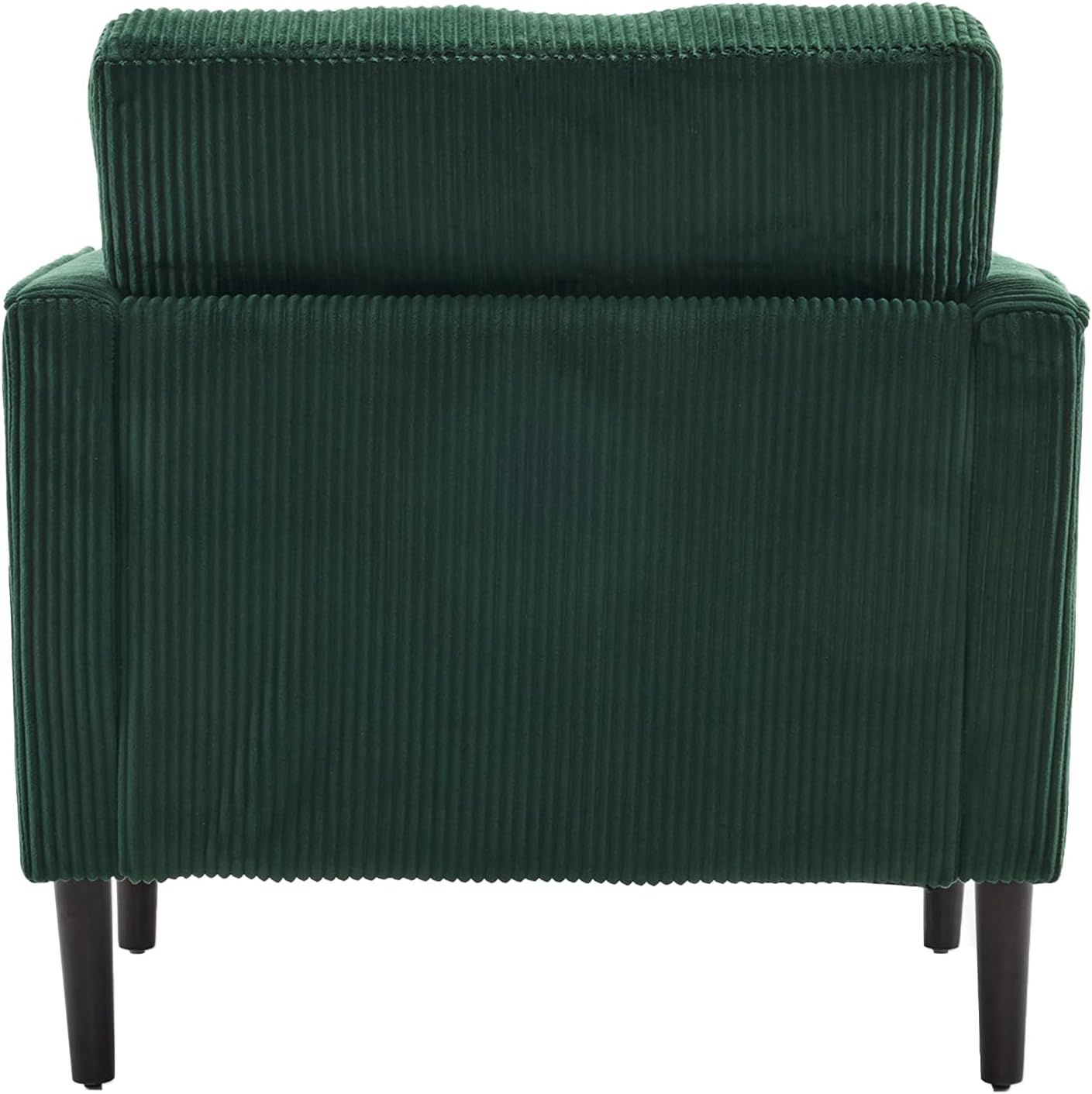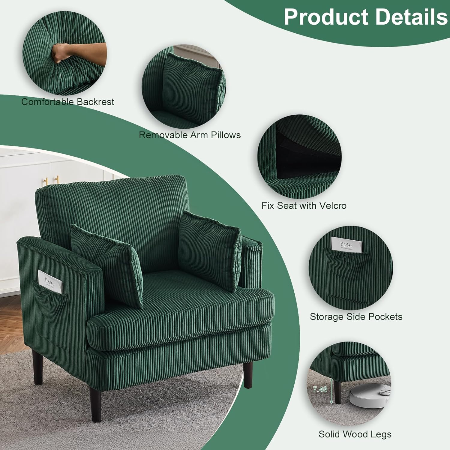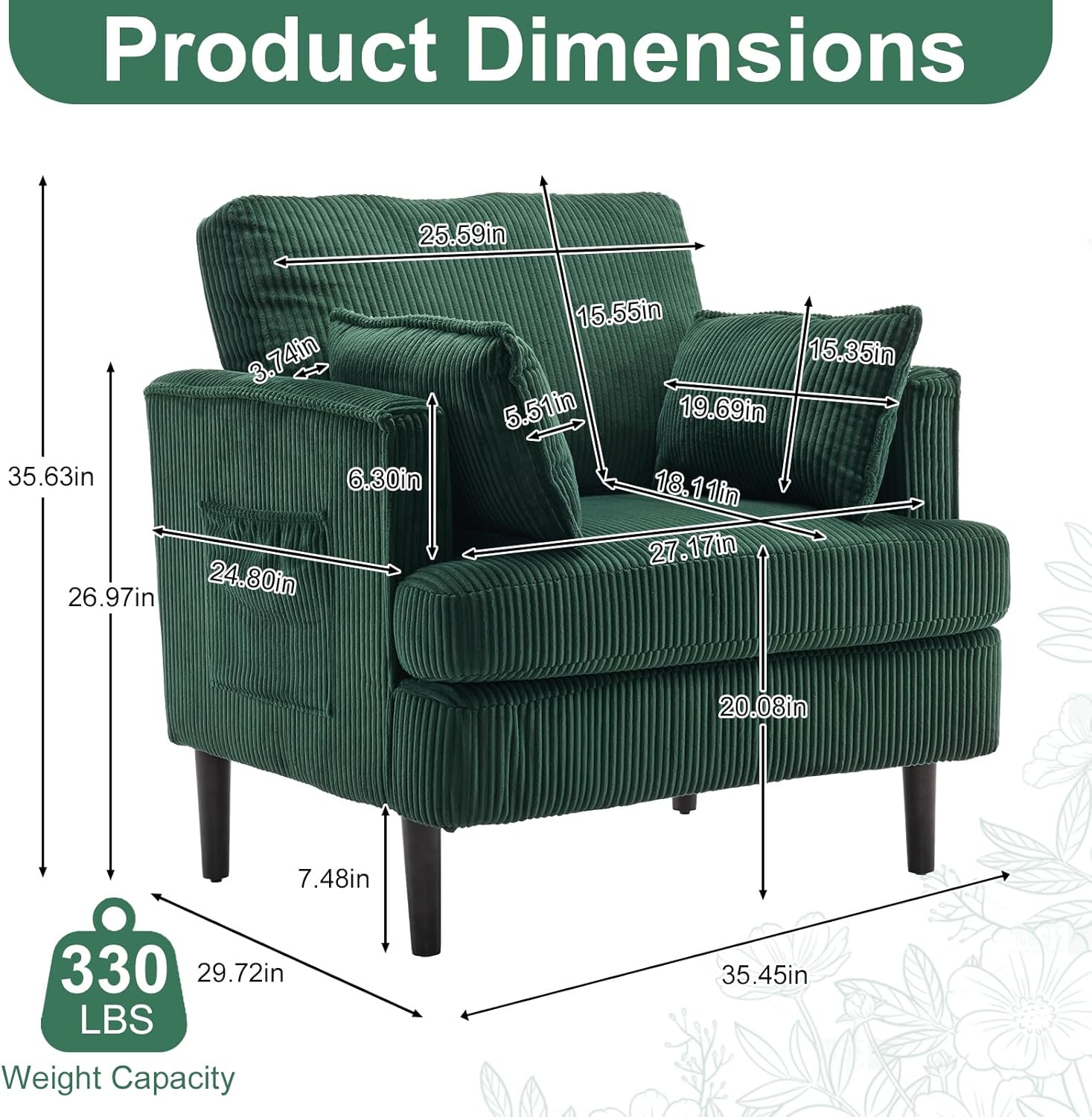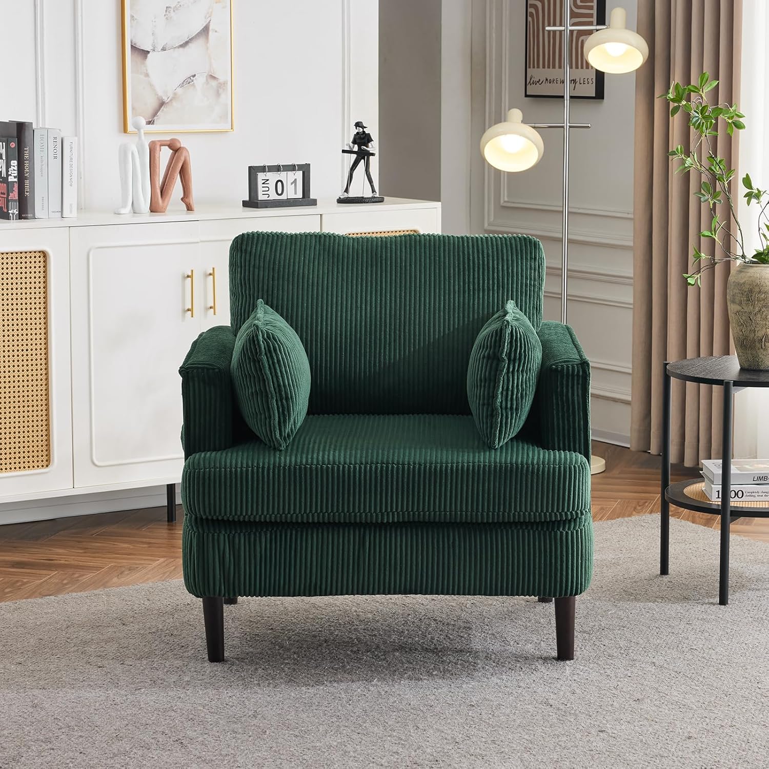 Karl home Modern Accent Chair, Corduroy Upholstered Armchair with 2 Pillow & Side Pocket, Sofa Barrel Chair with Solid Legs, Comfy Reading Chair for Living Room, Bedroom, Office, (Dark Green)