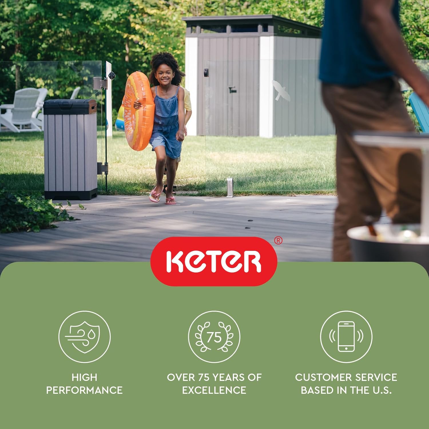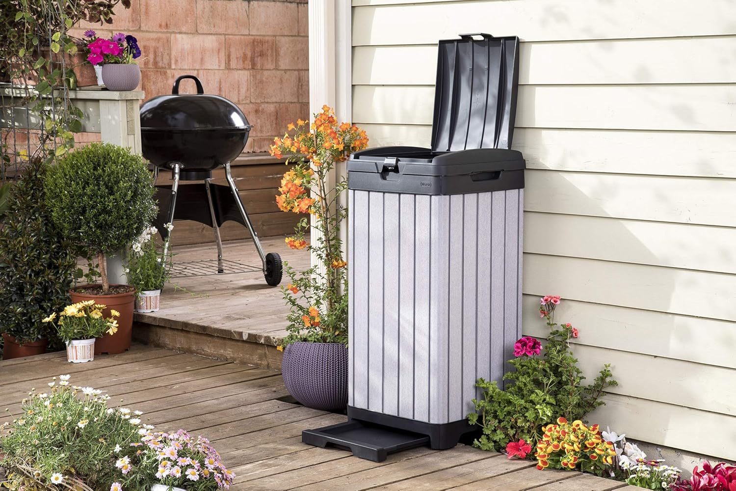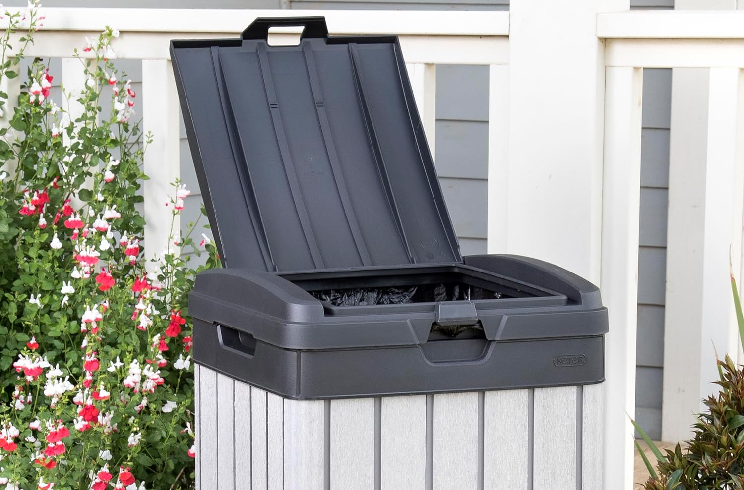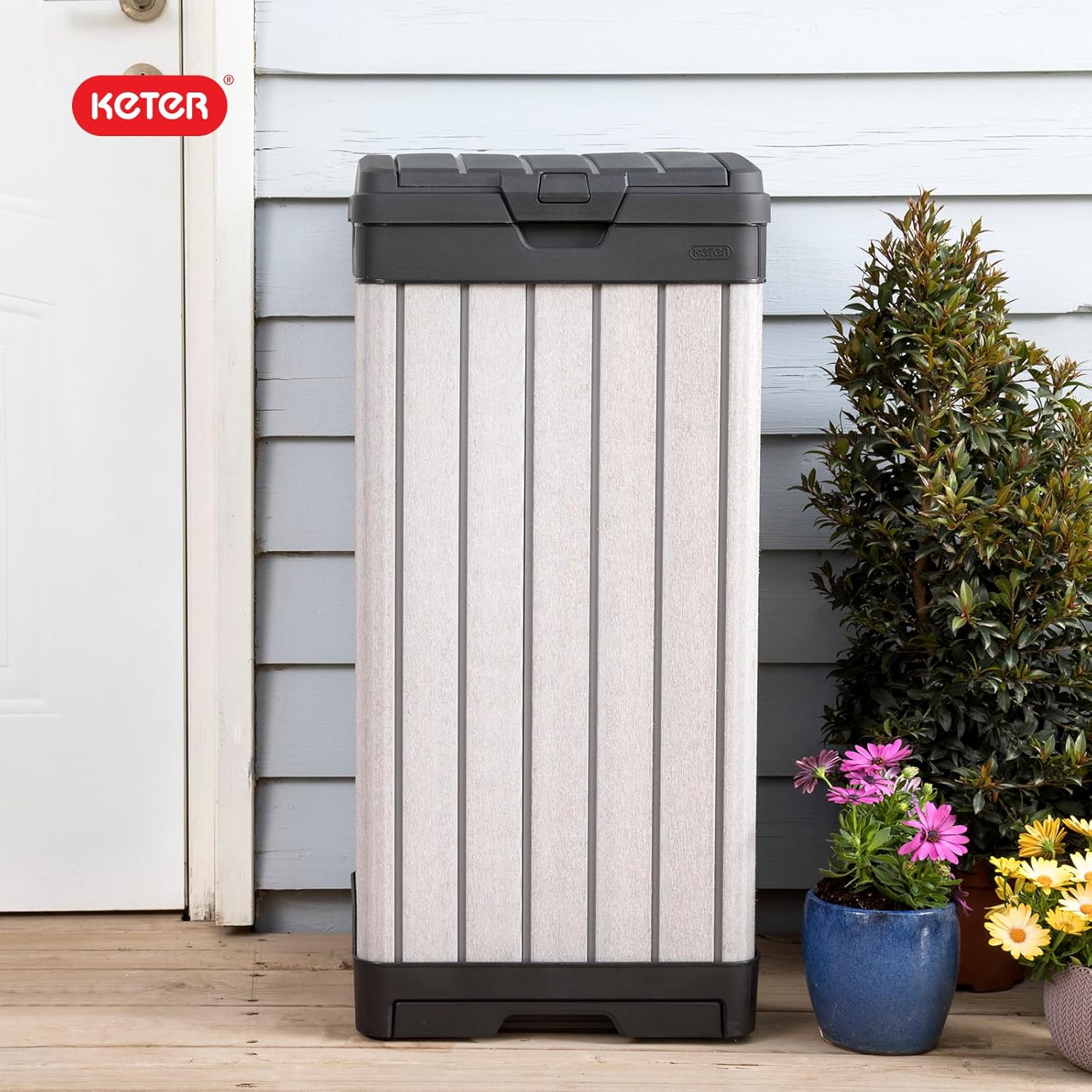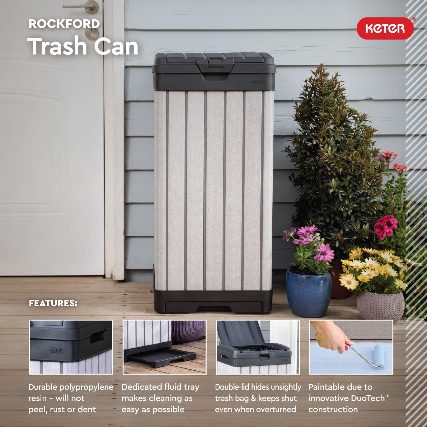 This Rockford Outdoor Trash Can by Keter is customizable to fit in with any outdoor furniture collection and retains its functionality. While the sleek double lid hides the bag inside, it is also keeping the bin shut when completely overturned – keeping your trash secure and your investment in waste disposal products protected. It has a dedicated easy-to-remove fluid drawer that makes cleaning the unit as easy as pie. It will never rust or dent and is low maintenance. This durable bin is the perfect addition to any outdoor space and matches any Keter product. Key Features: Dimensions: 16. 14 in. L x 16. 14 in. W x 34. 4 in. H Uses 30-39 gallon trash bags Designed with durable double-walled material Weather resistant – perfect for outdoor use Low maintenance – will never rot, rust, or decay Natural wood look and feel that will complement any outdoor decor Convenient plastic fluid tray for easy cleanup Double lid enclosure to hid trash bags Stays shut even when accidentally overturned
