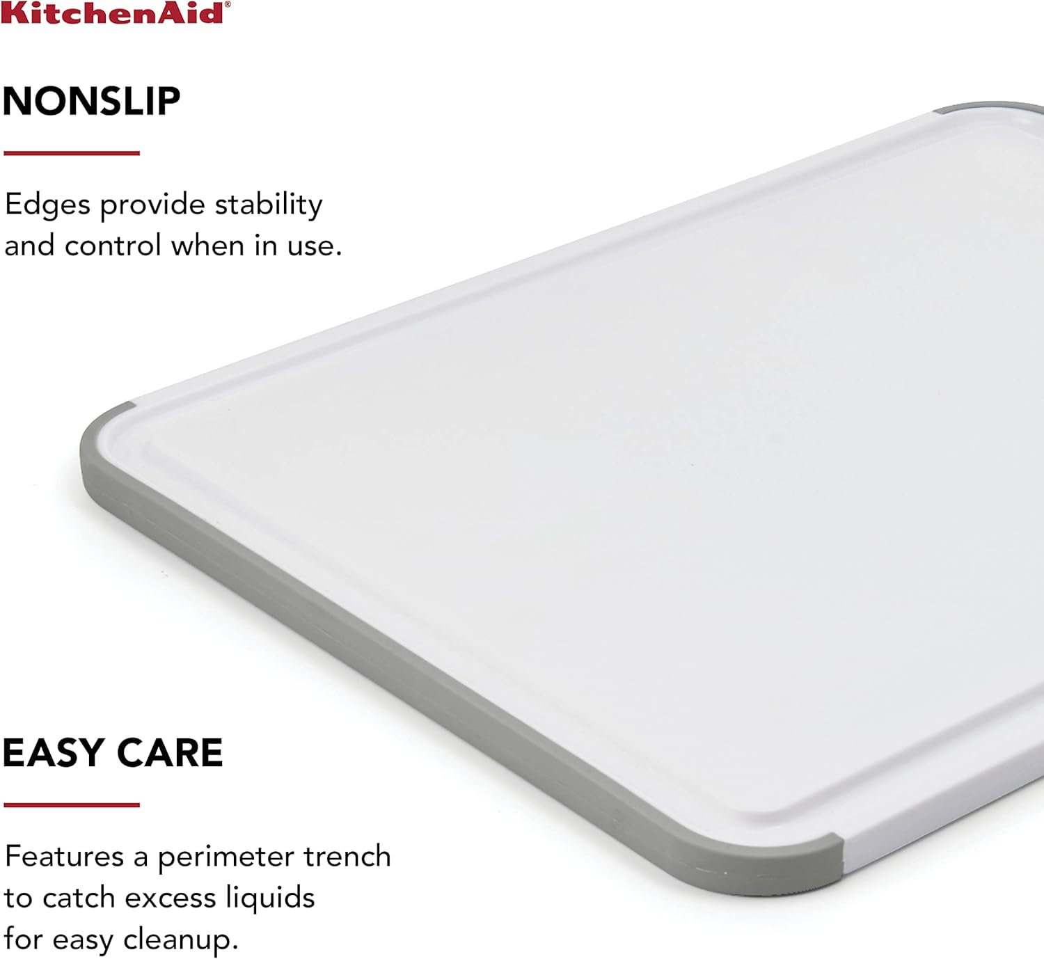 This KitchenAid Classic 11 x 14 plastic cutting board is the ideal size for everyday food prep tasks. This nonslip cutting board is expertly designed to provide an exceptional experience, whether for cutting, slicing, dicing, mincing, or chopping. This plastic cutting board is designed with nonslip edges for stability and control. This cutting board features a perimeter trench to collect excess liquids and is dishwasher safe for easy cleanup.