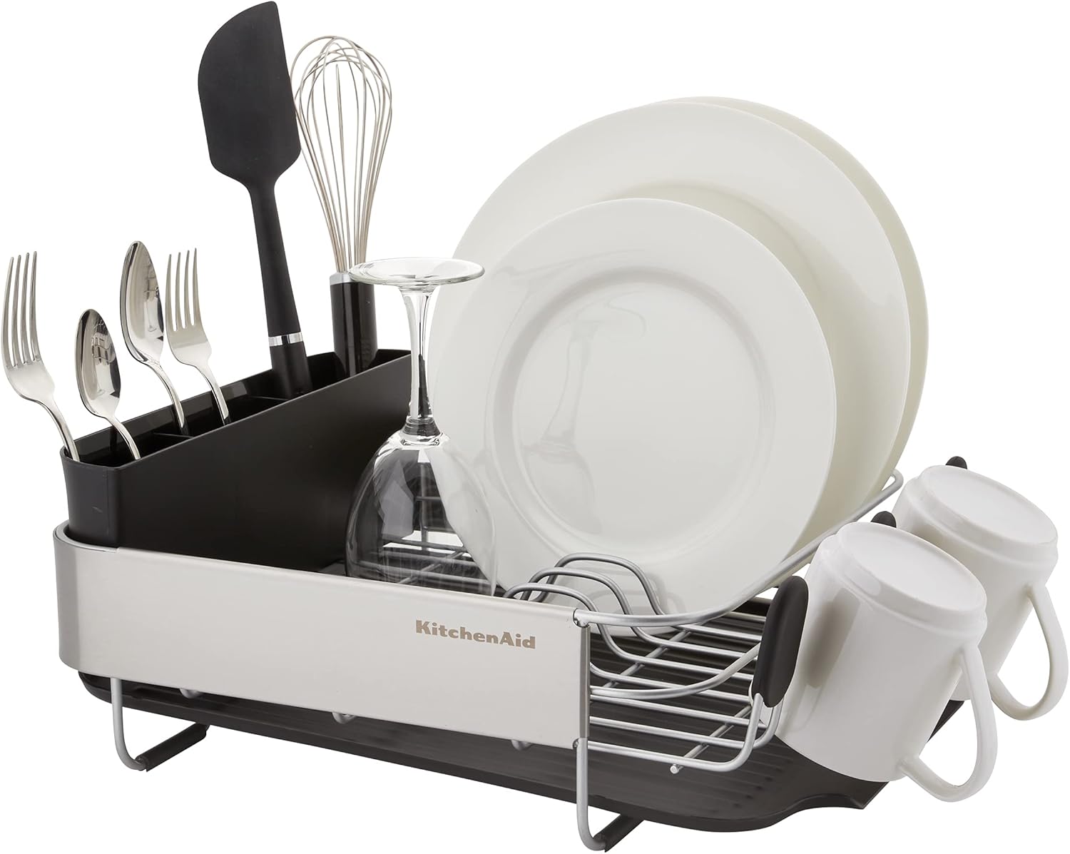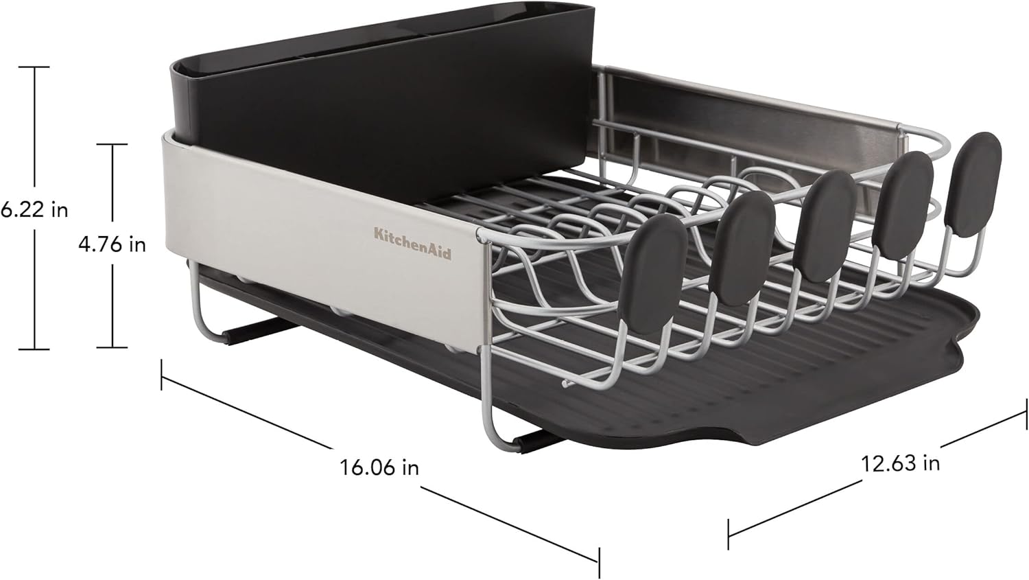 KitchenAid Compact, Space Saving Rust Resistant Dish Rack with Removable Flatware Caddy and Angled Self Draining Drainboard, 16.06-Inch, Black
