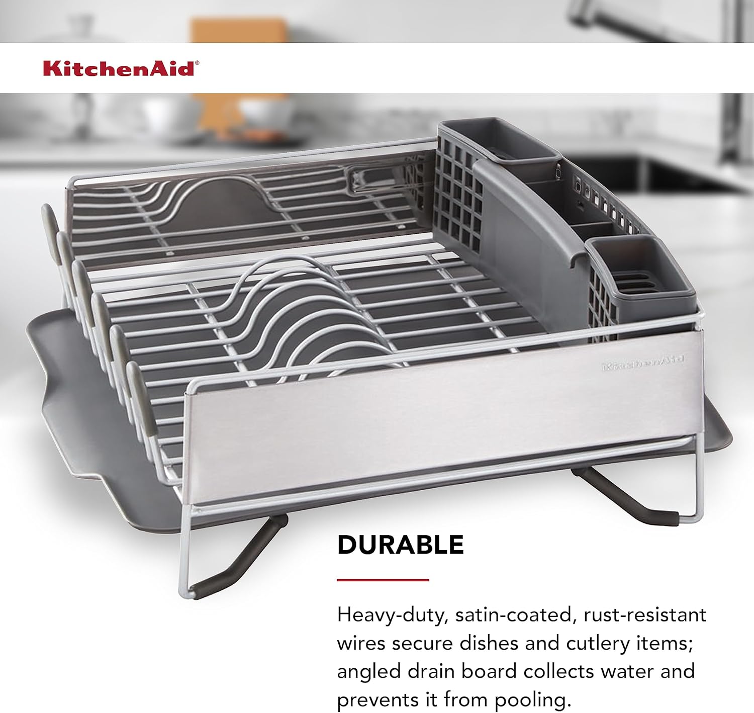 The KitchenAid Compact Stainless Steel Dish Rack is designed with smaller kitchens in mind, taking up minimal room on countertops while providing the perfect amount of space to air-dry kitchenware. It can hold up to 9 plates, 5 cups, and more. This drying rack features a flatware caddy, a dish rack, and a drainboard, and can be effortlessly assembled without tools. The soft, nonslip feet on the bottom keep it in place without scratching countertops. This durable rack has heavy duty, satin-coated, rust-resistant wires that keep items securely in place and allow for airflow to quickly and efficiently dry dishes, along with sturdy stainless steel panels that stand up to daily use. The angled drainboard directs water right into the sink without pooling, allowing for smooth draining and keeping countertops dry. Plus, it’s removable for easy cleaning. The caddy features a built-in handle and adjustable compartments for keeping items separated and simple to find. It also detaches from the rack for easy unloading into drawers and cabinets. Hand wash only. Lifetime Limited Warranty.
