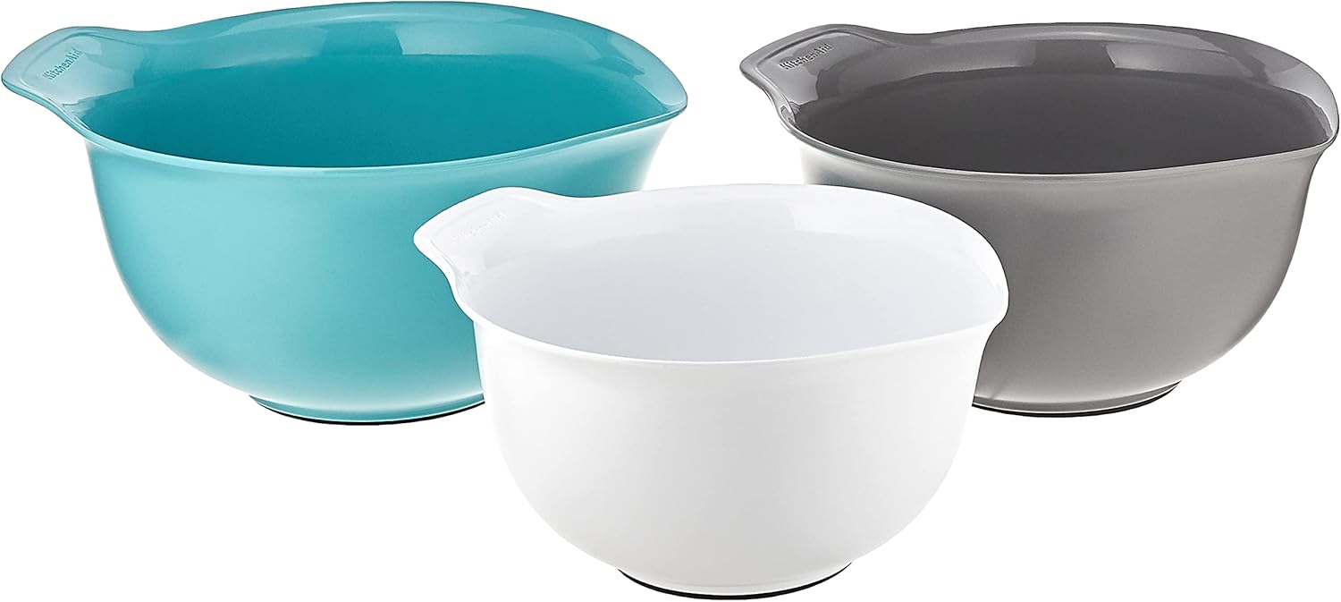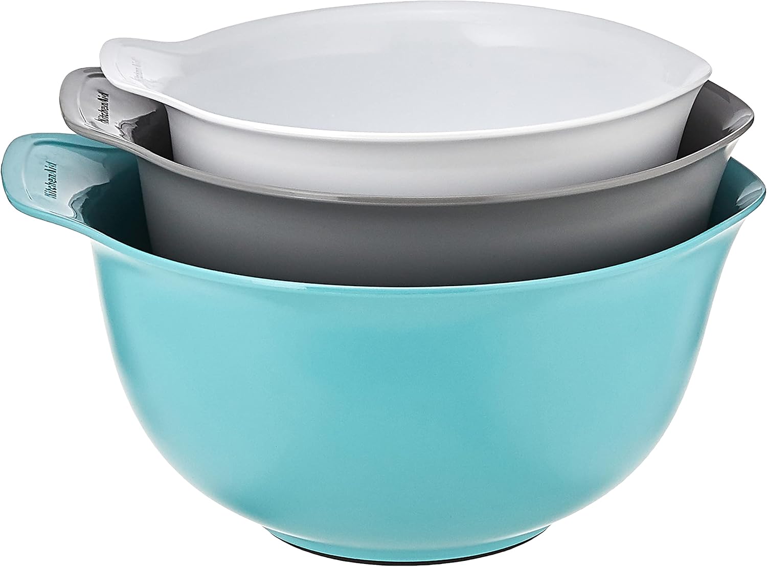 KitchenAid Universal Nesting Plastic Mixing Bowls, Set Of 3, 2.5 quart, 3.5 quart, 4.5 quart, Non Slip Base with Easy Pour Spout to Reduce Mess, Dishwasher Safe, Aqua Sky, White, Gray