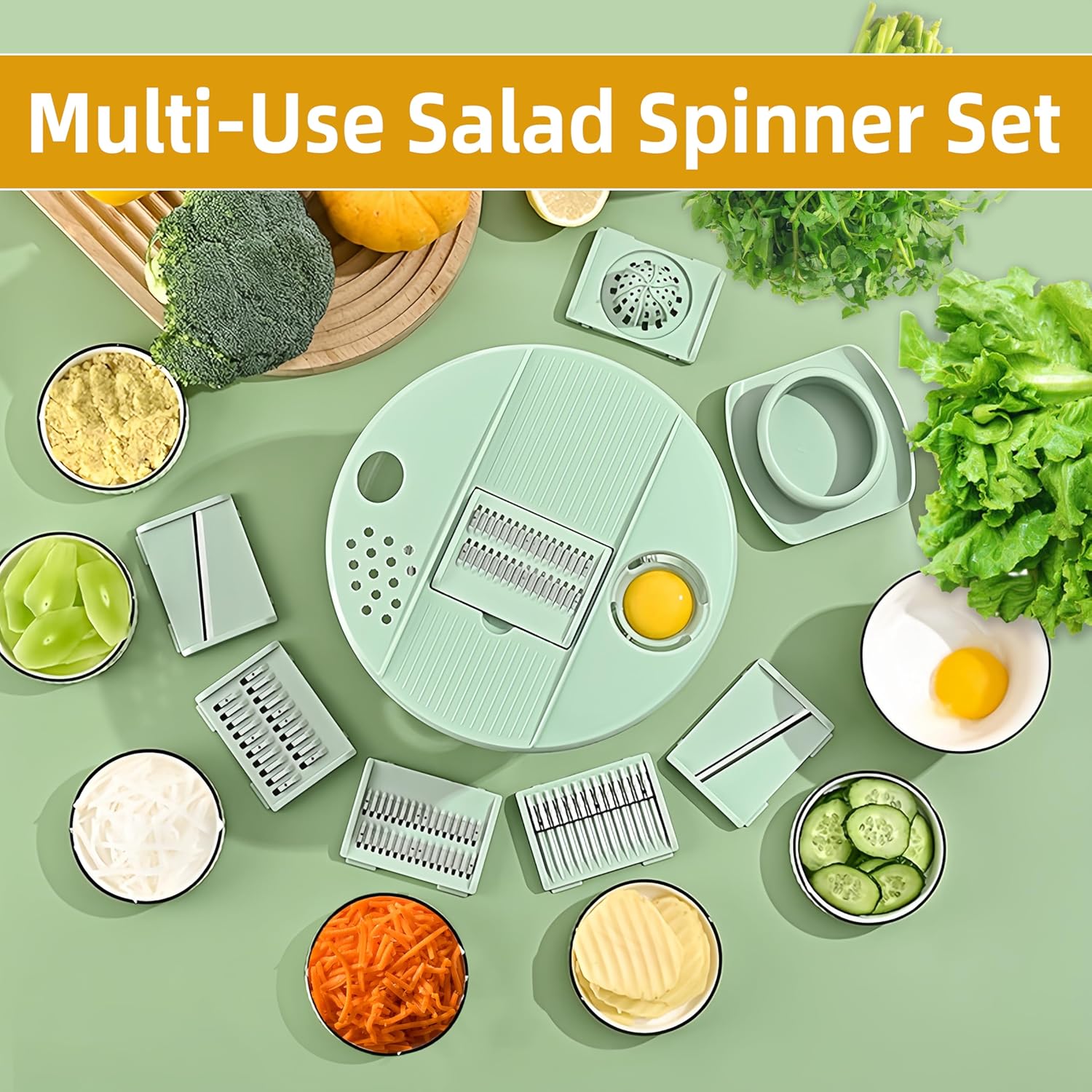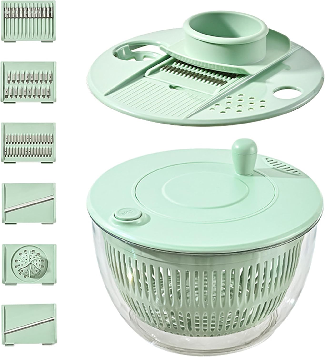 Multi-Purpose Kitchen Gadget – This versatile salad spinner set includes a bowl with lid ring, lettuce spinner disc, protective finger guard, grater disc, basket, two slicer discs, and two shredding blades for effortless meal prep.