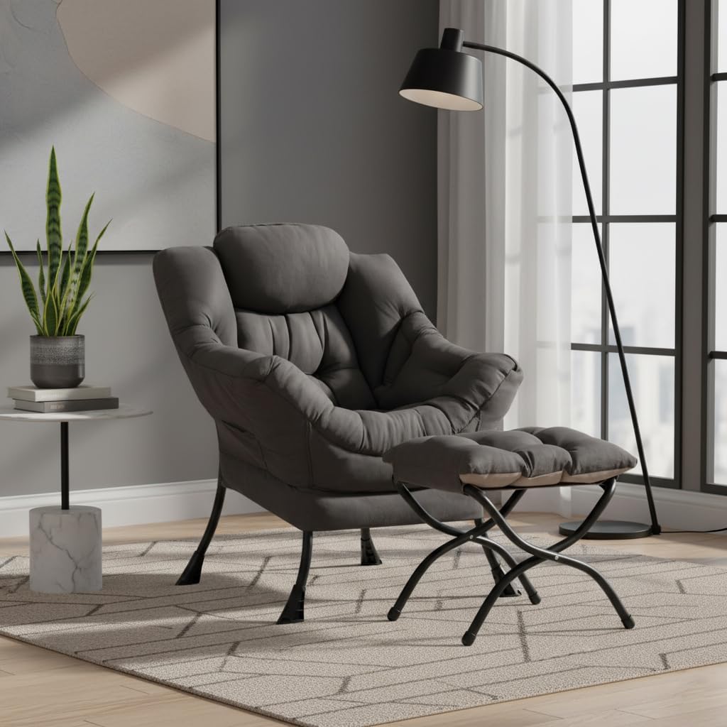 Lazy Chair with Ottoman, Modern Accent Chair Contemporary Lounge Leisure Sofa Chair with Armrests, Reading Chair and Folding Footstool Set for Living Room, Bedroom, Office, Dark Grey