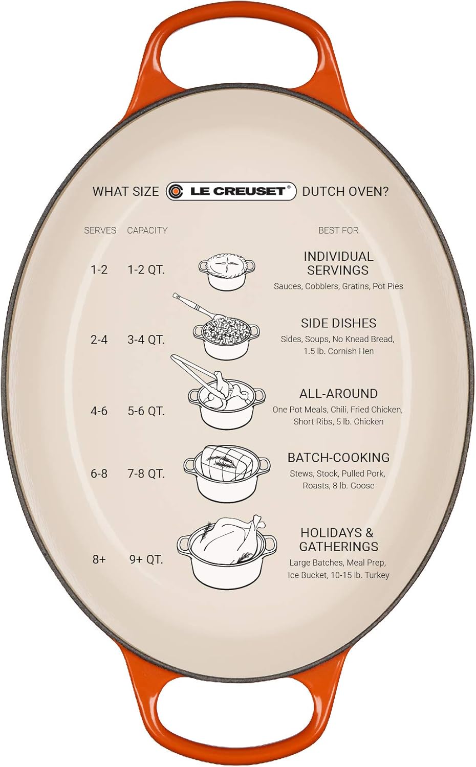 The iconic Le Creuset Signature Oval Dutch Oven is indispensable in the kitchens of home cooks and professional chefs alike. Expertly crafted from enameled cast iron, the everyday versatility of the Dutch Oven makes it ideal for everything from slow-cooking and braising to roasting, baking, frying and more. The oval shape is particularly suited for larger cuts of meat, whole chickens and for baking oval-shaped loaves of bread. Individually crafted by French artisans from the finest quality materials since 1925, it’s beloved for its perfected design and exceptional heat retention that locks in moisture and flavor to produce superior results from stove to oven to table. Designed for generations of durability, the easy-to-clean vibrant porcelain enamel requires no seasoning, minimizes sticking and is dishwasher-safe.