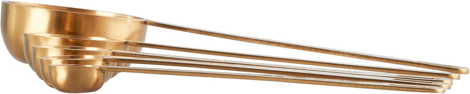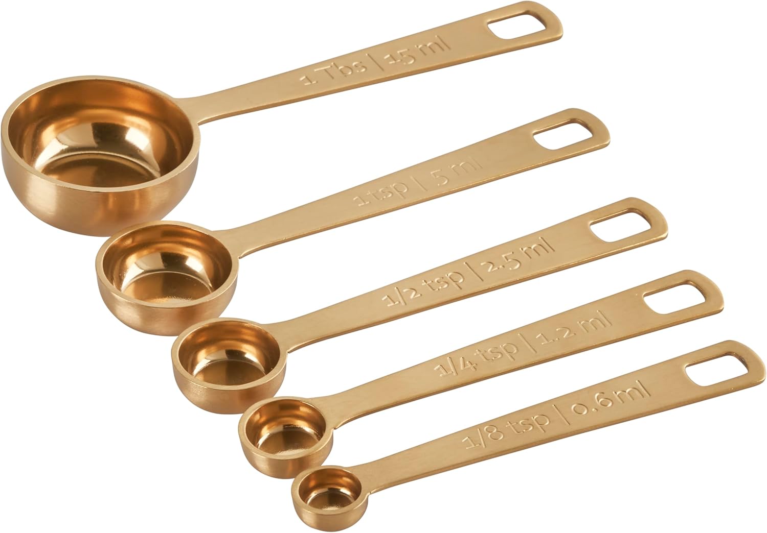 A must for any working kitchen, these stylish measuring spoons are crafted from high-quality materials and made of heavy-guage stainless steel with a PVD Gold finish. Five spoons measure 1/8 tsp, 1/4 tsp, 1/2 tsp, 1 tsp and 1 tbsp.