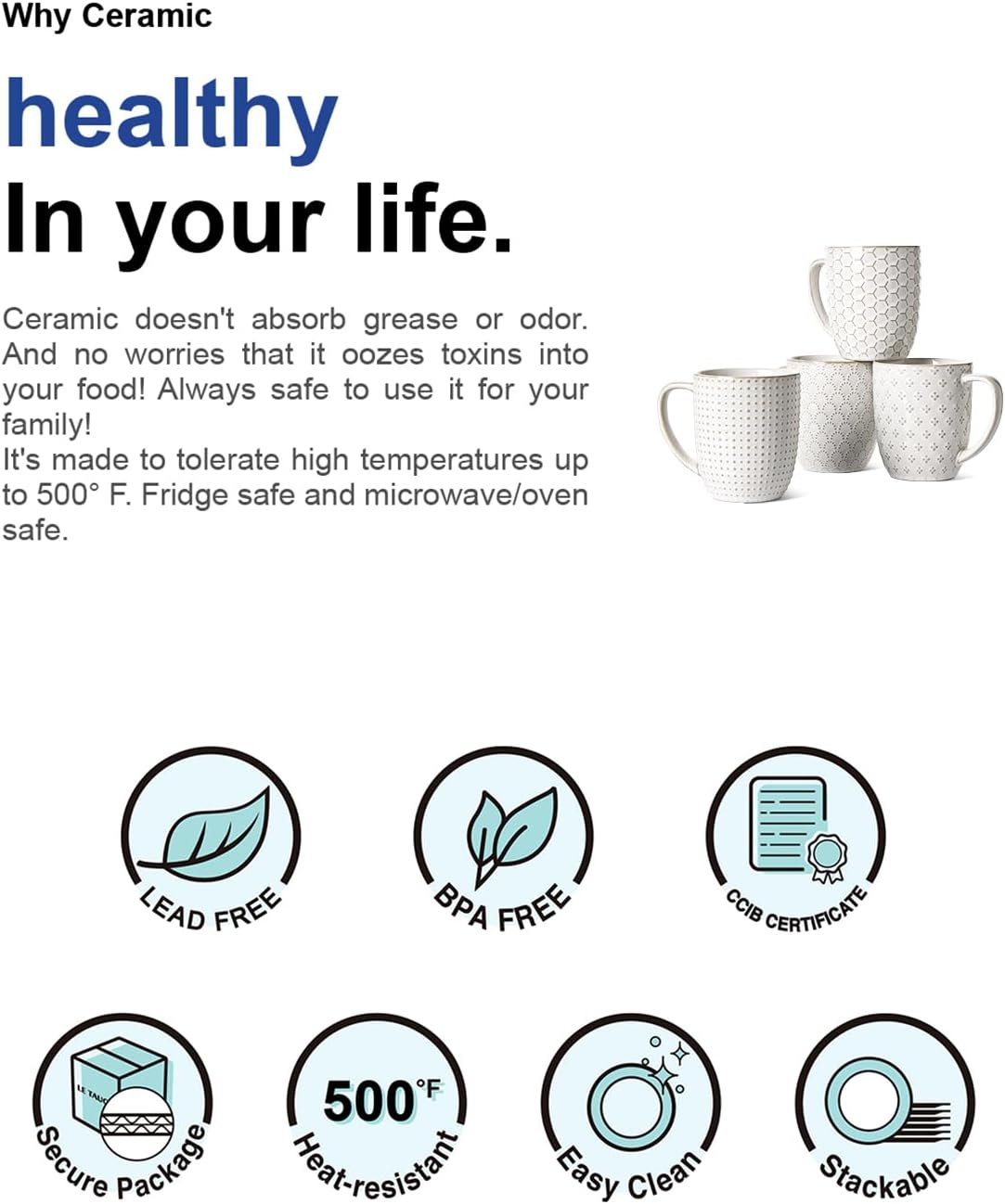 Excellent Ceramic Material: Made from natural clays, this ceramic is Amazon Climate Pledge Friendly certified and without any lead or cadmium, allows you to enjoy the taste of coffee. Thick cup wall, less temperature dissipation, locking in the coffee flavor better.Easy to clean, difficult to leave stains and odors, dishwasher safe