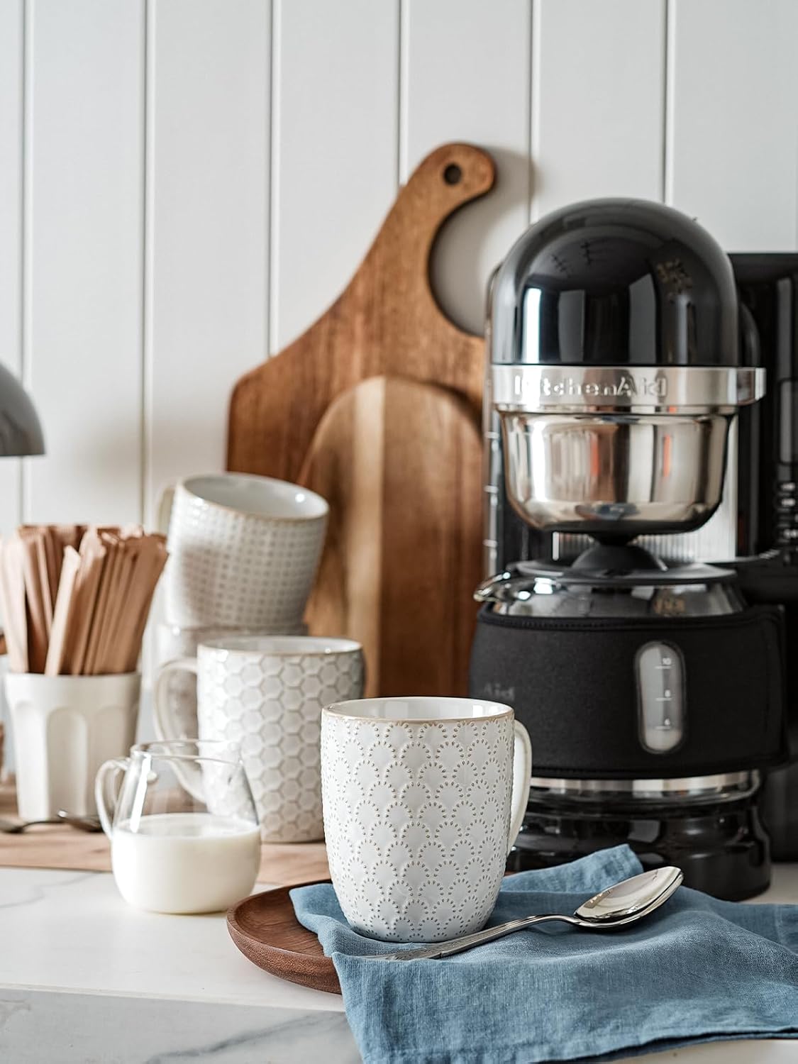 Practicality And Aesthetics: The traditional coffee mug shape with the unique embossing is an innovation of our coffee cups.The relief pattern of each cup is different. The smooth and clean white inner wall of the mug allows for a good observation of the color of the coffee, while the thicker wall can maintain the temperature and flavor of the coffee, works well under coffee machines including Ke*urig, Nes*presso, Bre*ville, De*Longhi, and others