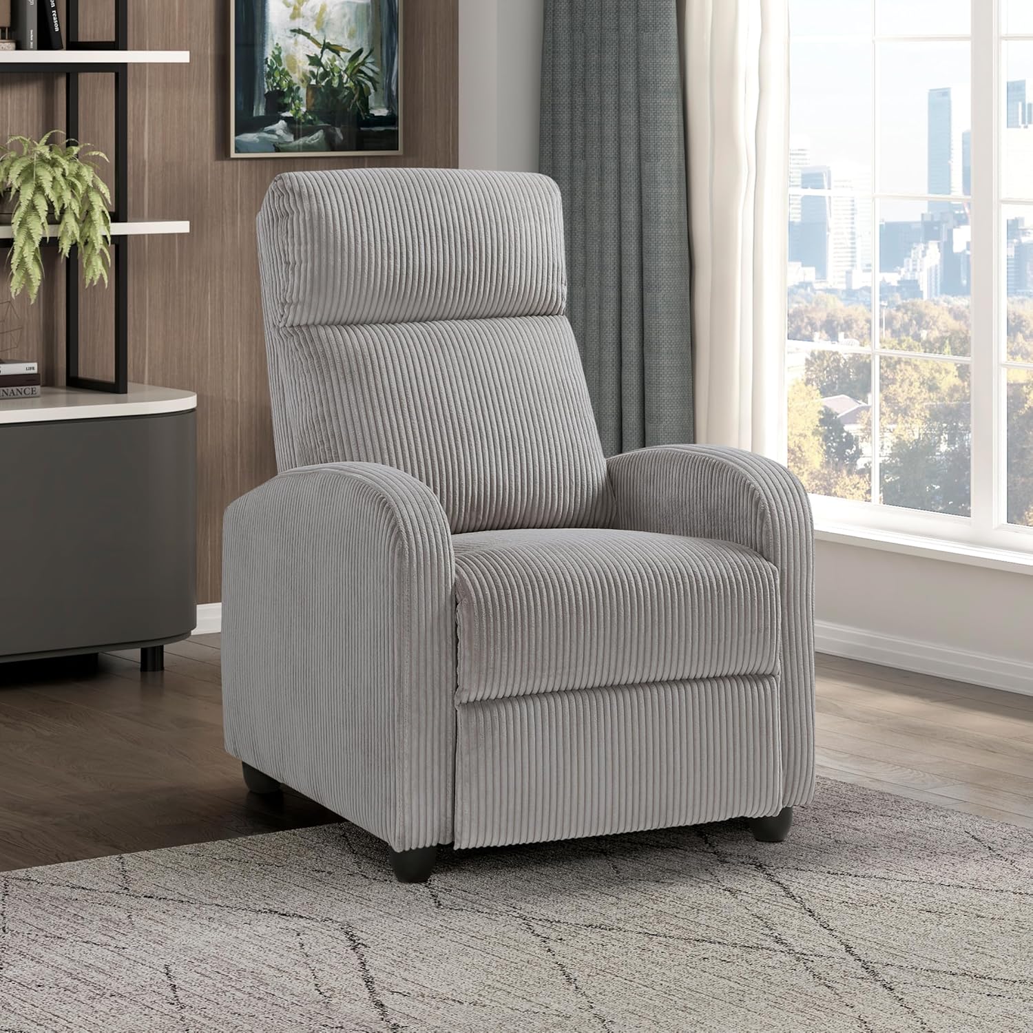 [Deep Cushioned Comfort] Our recliners for small spaces are upholstered in a soft, corduroy fabric, it blends seamlessly with your existing décor. Relax in this wonderful comfy chair with soft padding, attached high back and seat cushions. Comfy to where you need a recliner chair for bedroom to relax