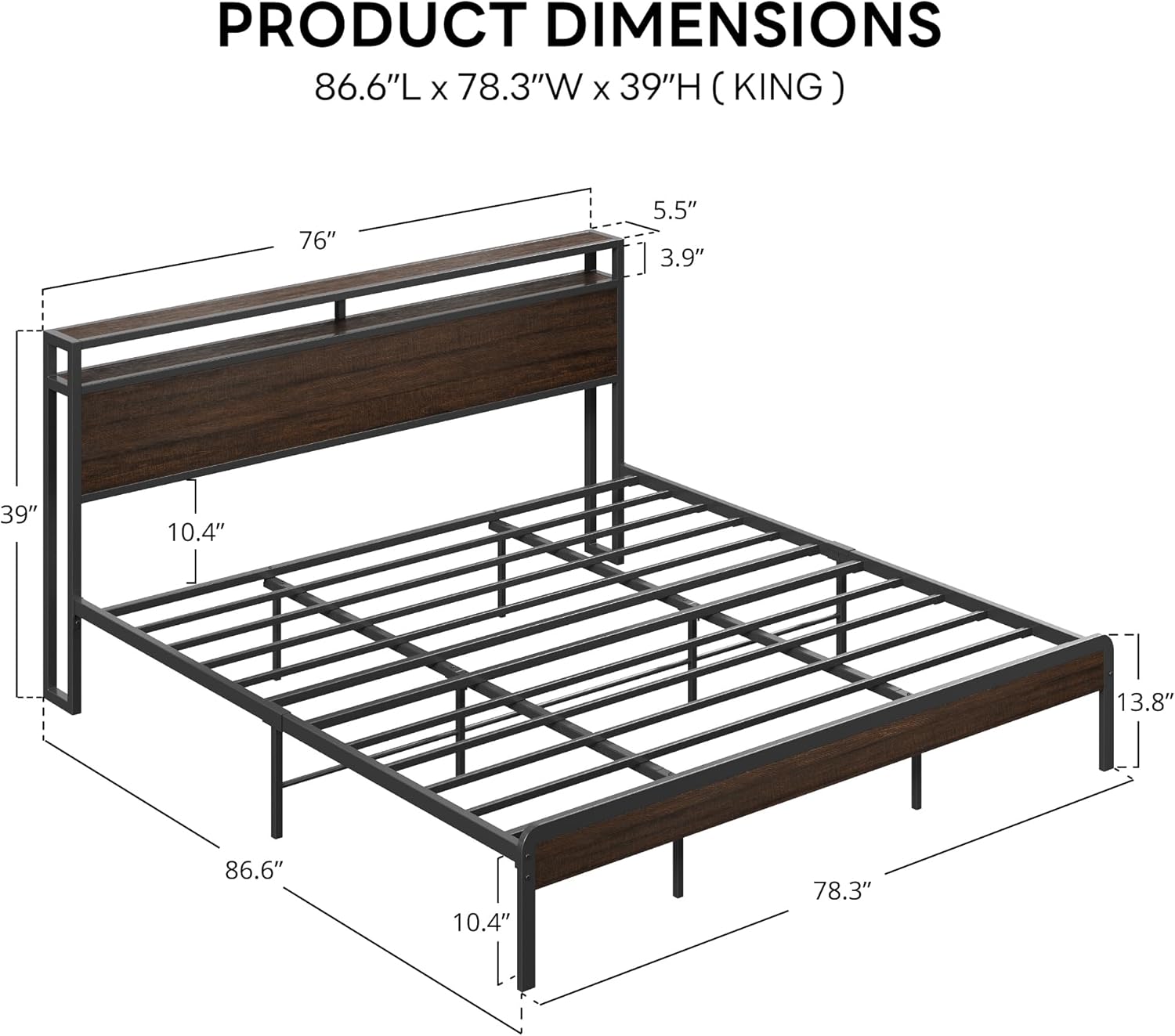 Color Dark Brown Material Metal Supports Frame, MDF Headboard Dimension 86.6 “L x 78.3 “W x 39 “H Headboard Shelf Size 78.3 ” *5.5 ” Under-bed Storage 10.4 ” Weight Capacity 1100 lbs Noise-Free Yes No Box Spring Needed Yes Recommended Mattress Size King — 76 x 80 inches (or 193 × 202 cm)
