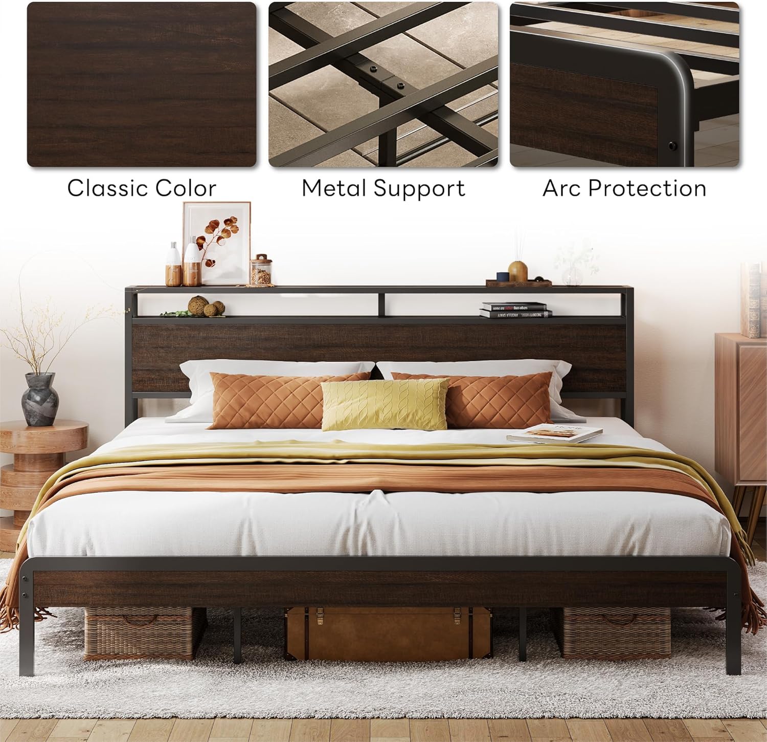 LIKIMIO King Bed Frame with Headboard, Dark Wood Camas King with Strong Supports, Sturdy, Noise-Free, No Box Spring Needed, Dark Brown