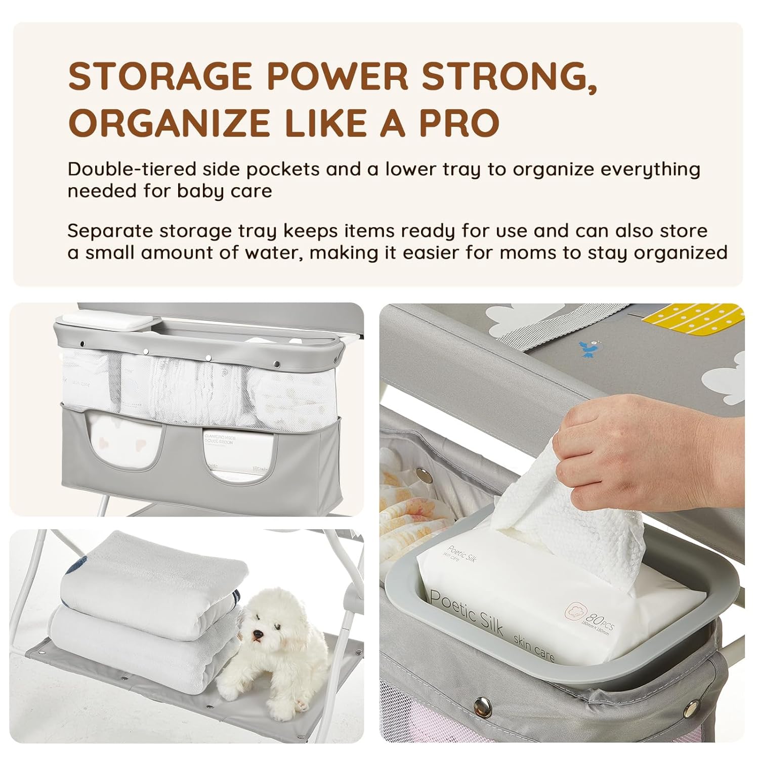 2-Tiers of Large Capacity Side Storage Baskets: Equipped with high-quality double-layer storage baskets, it allows parents to effortlessly accommodate 30 diapers, towels, wipes, and extra clothes all organized and easy to grab. The spacious bottom shelf provides extra space for baby essentials, and the included storage basin keeps everything neat and within reach