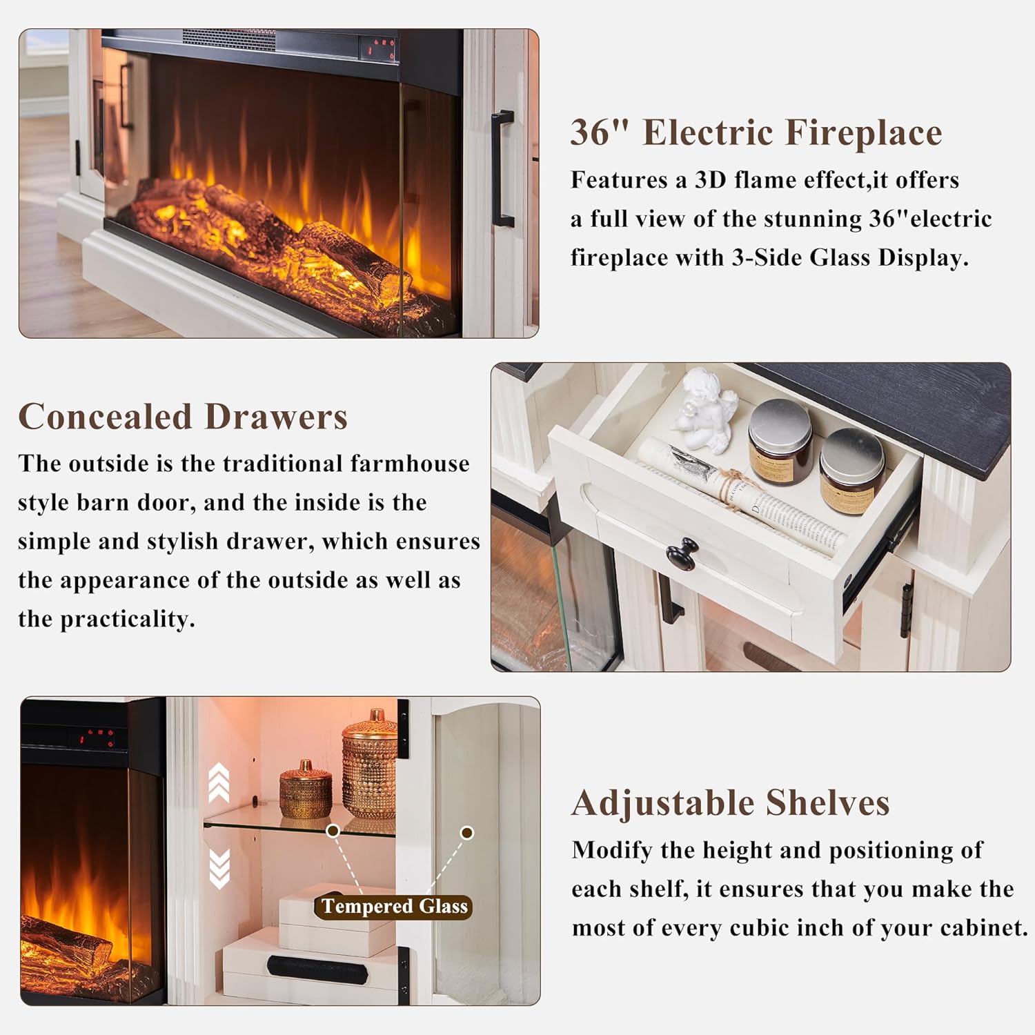 【Safe and Durable Crafted from MDF】It boasts double top panels and a 4” thickened base for long-term sturdiness, Holds up to 300 lbs with ease. High-Quality mute slide rail and hinges offer a cushioned anti-pinch function. Rest easy with our Fireplace Safety Guarantee, featuring overheat protection and ETL/FCC certifications. All the glass in this cabinet is high-strength tempered, which can provide higher strength and minimize damage. Elevate your home with this reliable and chic addition!