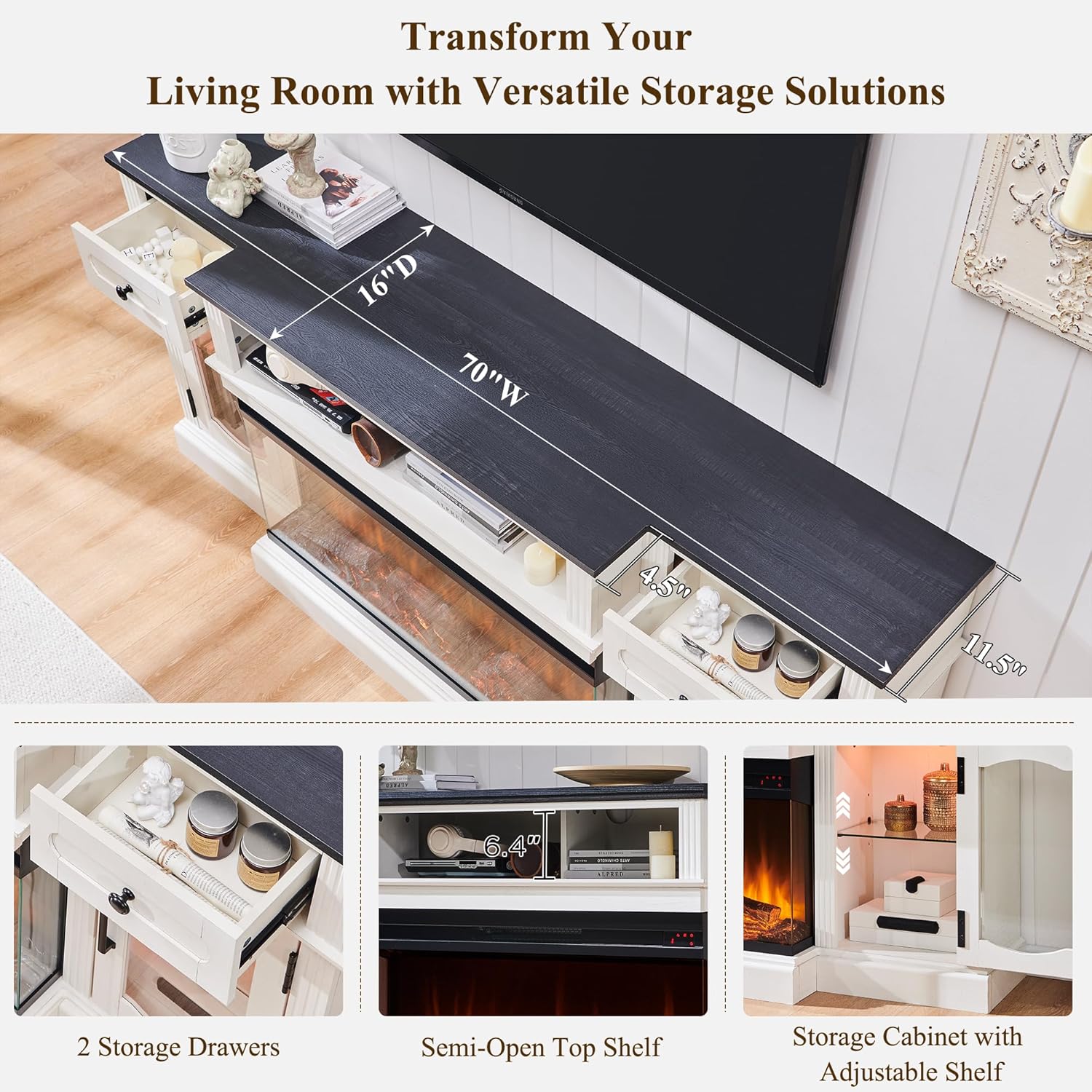 【70” Larger Storage Space TV Stand】 Size:70(W)*16(D)*32(H) in, accommodating TVs up to 80″. Store DVDs neatly in 2 of open highboys and 2 widened drawers. Keep your game consoles in the super large closed storage cabinets with adjustable shelves. Stay organized with the cable management hole at the back.