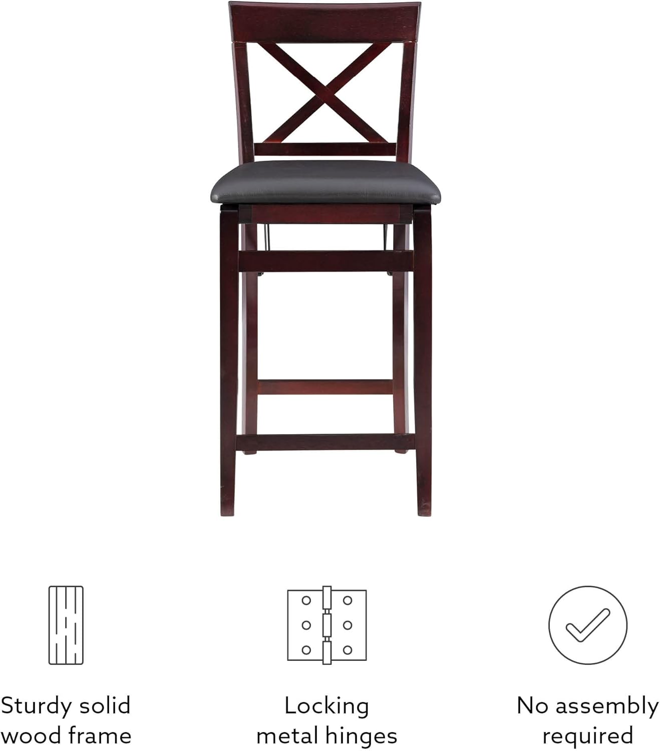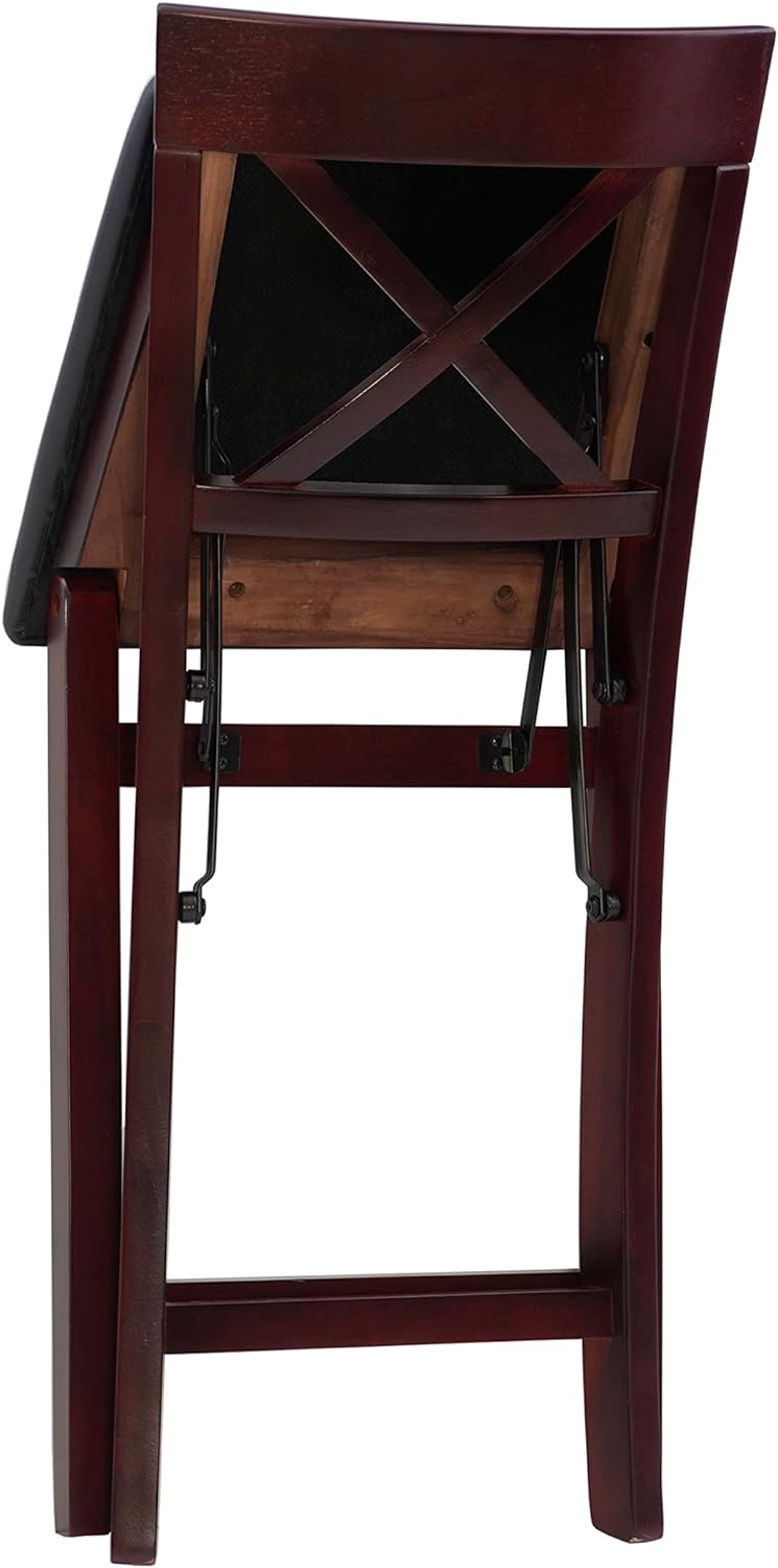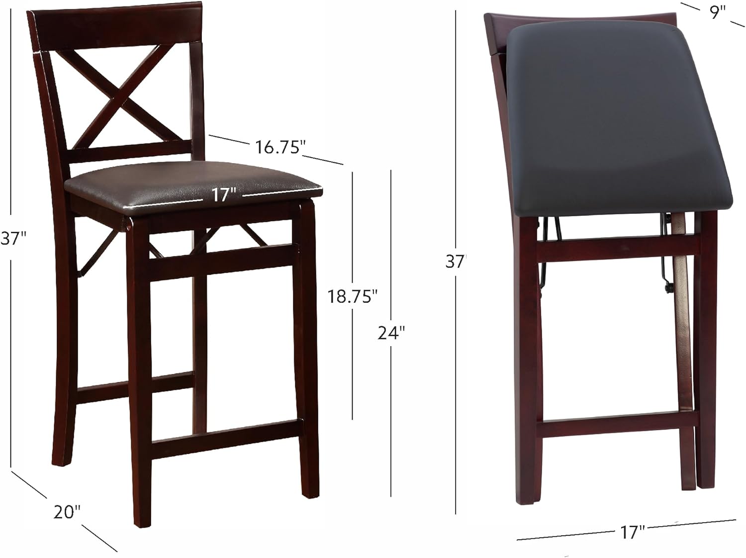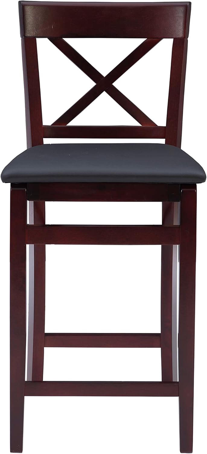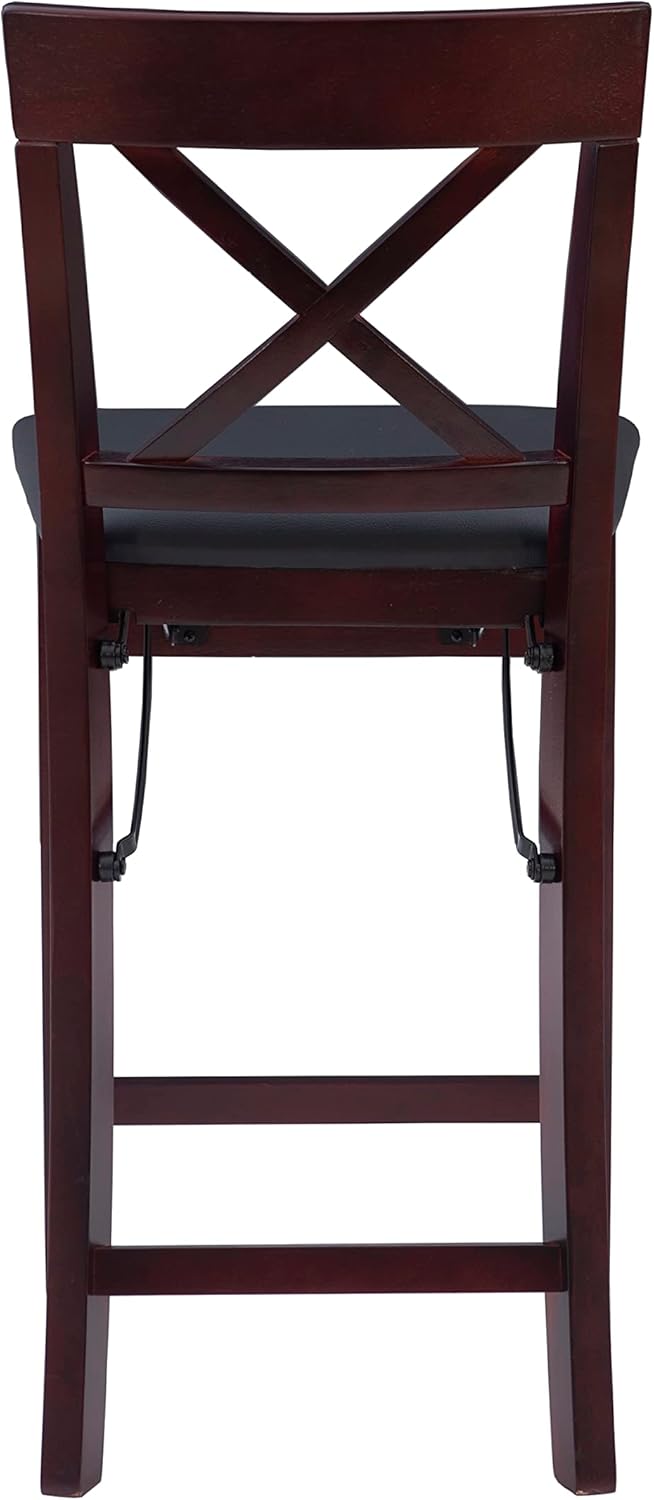 The elegance and unique style of this x back folding counter stool will carry throughout your kitchen, dining, or home pub area. Finished in a rich merlot, the seat is upholstered in a wipe clean brown faux leather. The folding feature makes it simple to easily store the stool when space is needed. Front and rear supports provide stability. 24″ seat height. 275 pound weight limit.